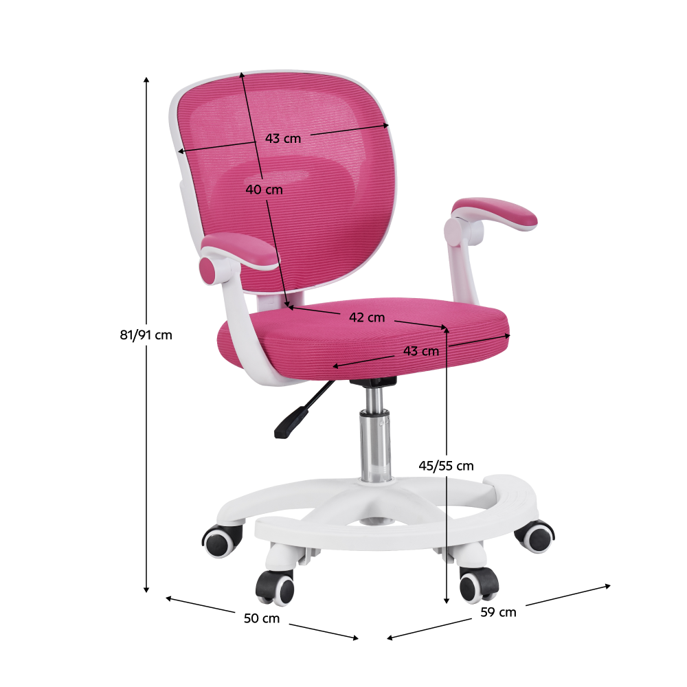 Materiál: sieťovina/plastOderuodolnosť sieťoviny podľa testu Martindale: 90 000 oderovFarba: malinová/bielaRozmery (ŠxHxV): 59x50x81-91 cmVýška sedu: 45-55 cmHĺbka sedu: 42 cmŠírka sedu: 43 cmVýška chrbtovej opierky: 40 cmŠírka chrbtovej opierky: 43 cmNosnosť: 90 kgOtočná stoličkaNastaviteľná výška seduOpierky na ruky s funkciou sklopeniaUniverzálne kolieskaKolieska sú vhodné na mäkké aj tvrdé podlahyPodnož na nohyDodávané v demonte