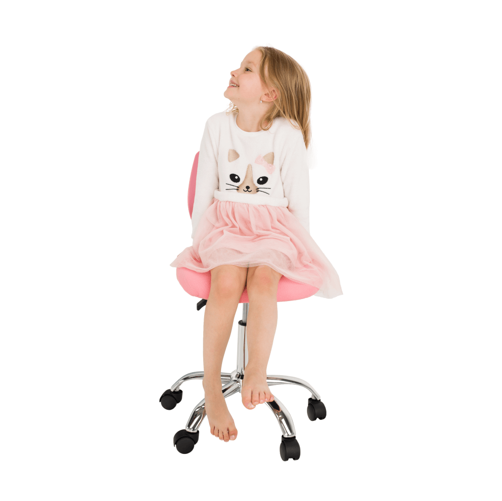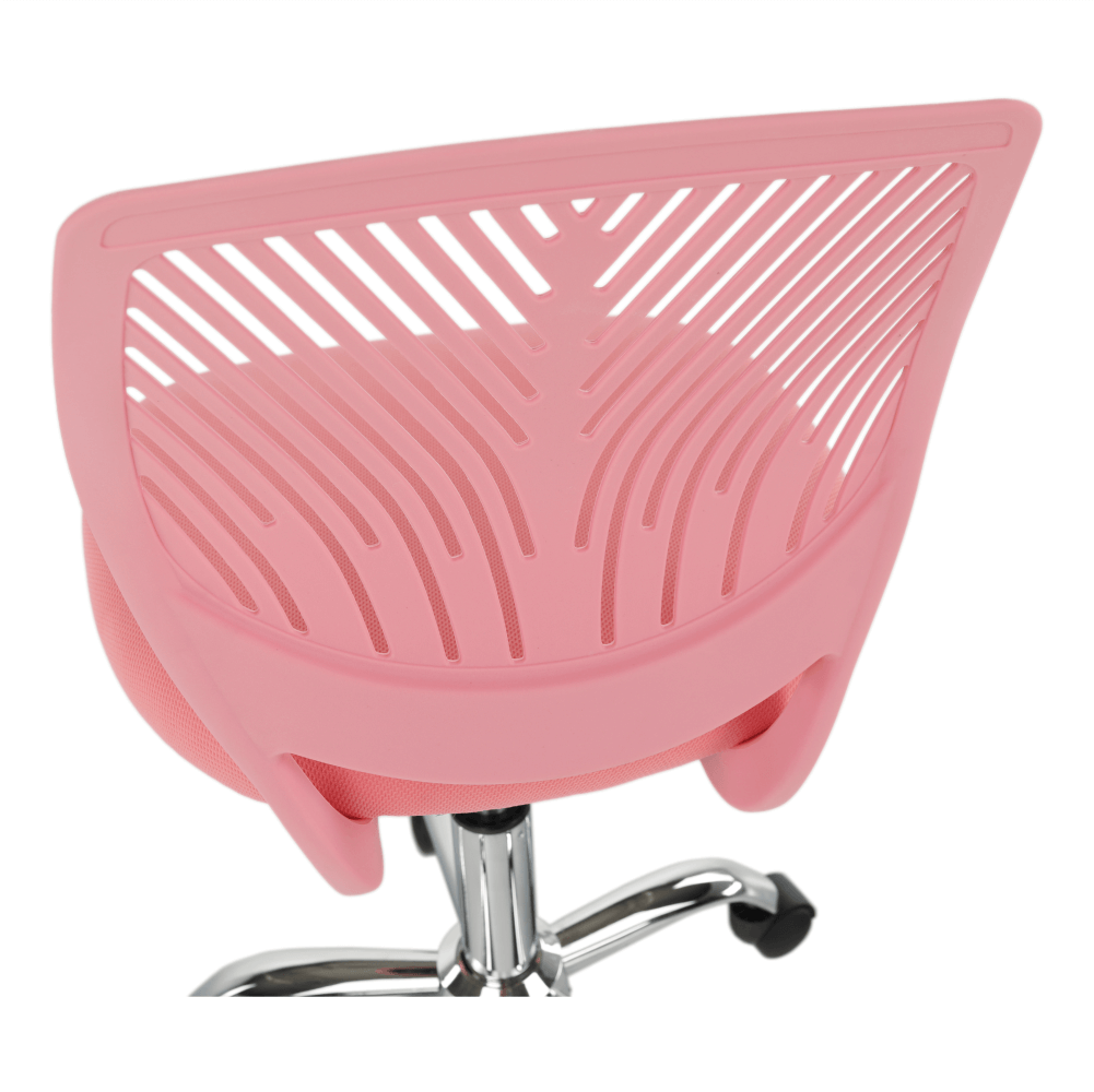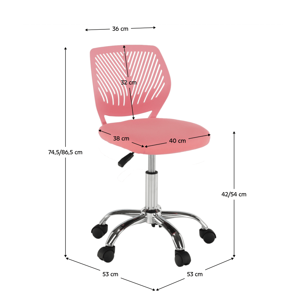 Materiál: polyester/kovOderuodolnosť textílie podľa testu Martindale: 100 000 oderovFarba: ružová/chrómRozmery (ŠxHxV): 53x53x74,5-86,5 cmNastaviteľná výška sedu : 42-54 cmHĺbka sedu : 38 cmŠírka sedu : 40 cmVýška chrbtovej opierky: 32 cmŠírka chrbtovej opierky: 36 cmNosnosť: 80 kgOtočnáS kolieskamiPerforované operadloDodávané v demonte