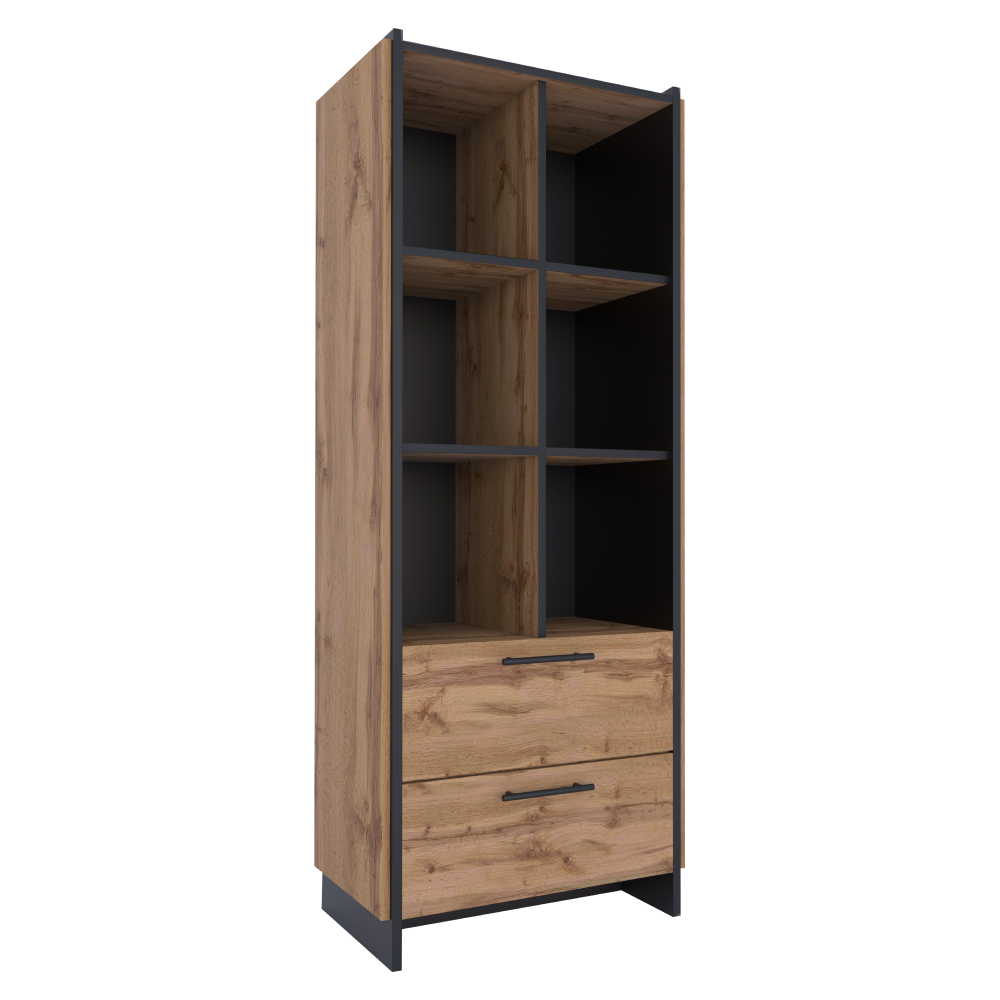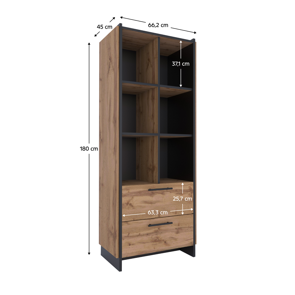 Materiál: DTD laminovaná/ABS hranyFarba: dub wotan/čiernaRozmery (ŠxHxV): 66,2x45x180 cmHrúbka materiálu: 1,6 cmKovové úchytkyFarba úchytiek: čiernaOtvorenýPolicovýNosnosť police: 5 kgVýška medzi policami: 37,1 cmŠuplíkNosnosť šuplíka: 5 kgVýška šuplíka: 25,7 cmDvojitá laminovaná DTDPlastové nožičkyModerný dizajnOdporúčame pripevniť k steneDodávané v demonte