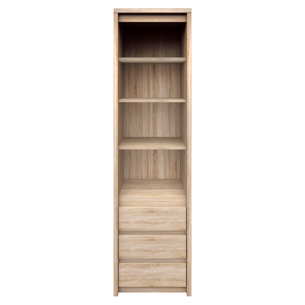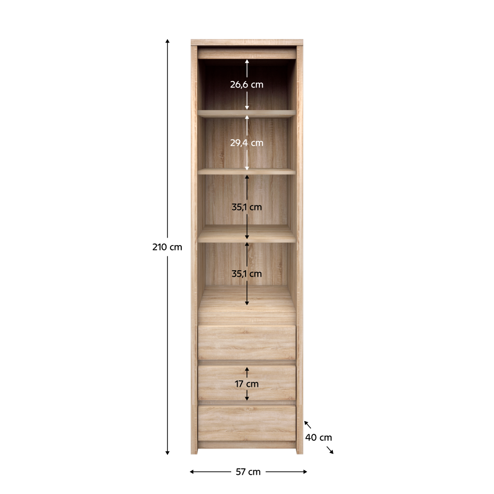 Otvorený regál so šuplíkmi 3S NORTY TYP 6Materiál: DTD laminovanáPrevedenie: dub sonomaRozmery (ŠxHxV): 57x40x210 cmHrúbka materiálu: 32 mmHrúbka materiálu zvyšné časti: 16 mmDodávané v demonte.