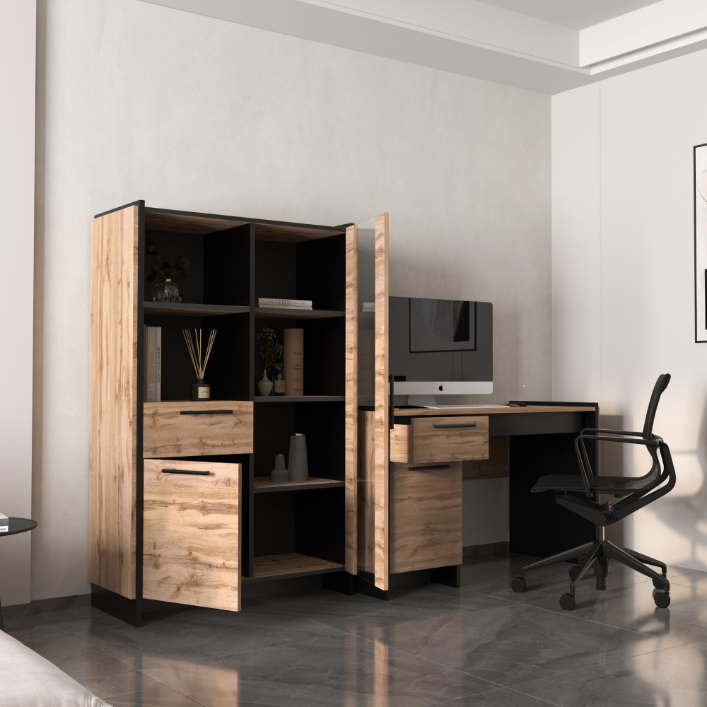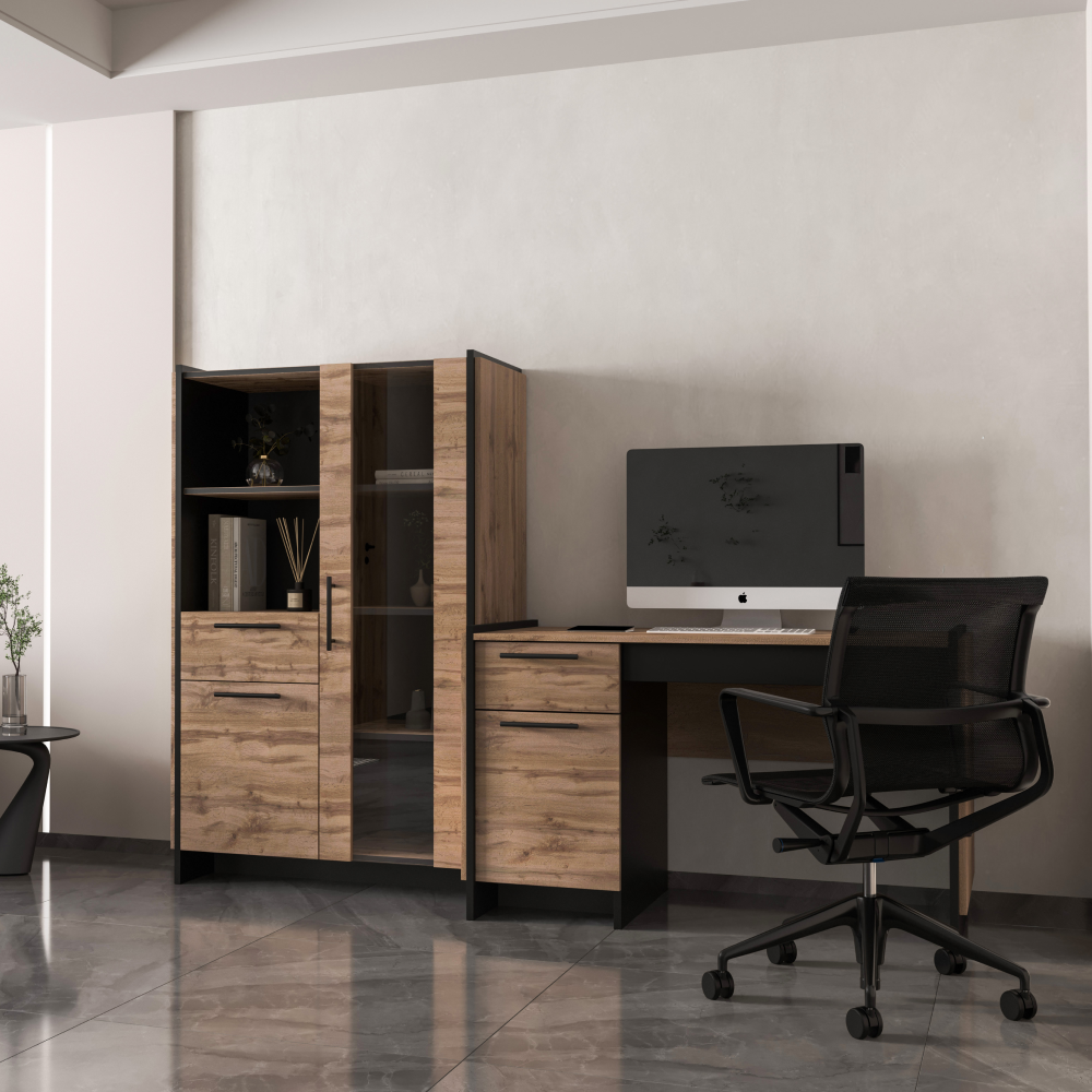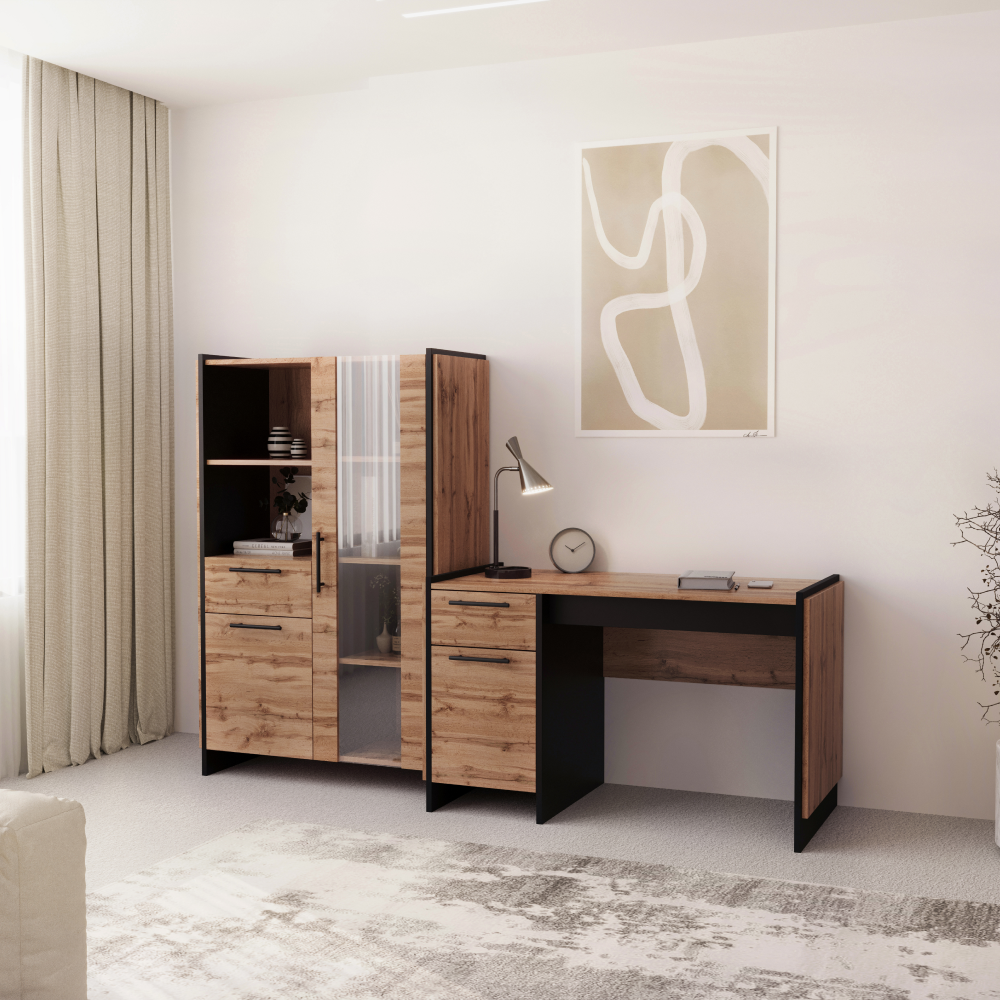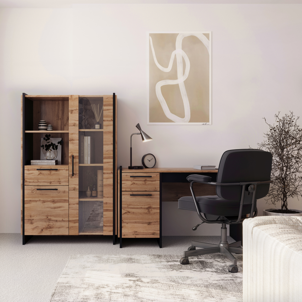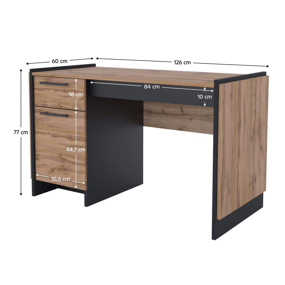 Materiál: DTD laminovaná/ABS hranyFarba: dub wotan/čiernaRozmery (ŠxHxV): 126x60x77 cmHrúbka materiálu: 1,6 cmKovové úchytkyFarba úchytiek čiernaNosnosť vrchnej dosky: 20 kgÚložný priestorSkrinka s dvierkamiPolicaNosnosť police: 5 kgŠuplíkNosnosť šuplíka: 5 kgVýška šuplíka: 18 cmS výsuvom na klávesnicuDvojitá laminovaná DTDPlastové nožičkyModerný dizajnOdporúčame pripevniť k steneDodávané v demonte