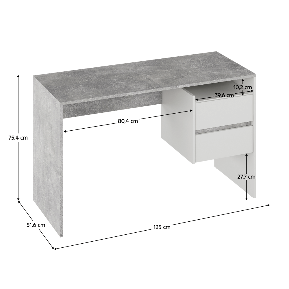 Materiál: DTD laminovanáFarba: betón/bielyRozmery (ŠxHxV): 125x51,6x75,4 cmHrúbka materiálu: 1,6 cmŠírka priestoru na stoličku: 80,4 cmDva šuplíkyOtvorený úložný priestorNosnosť šuplíka: 5 kgNosnosť dosky stola: 35 kgKvalitný slovenský výrobokDodávané v demonte