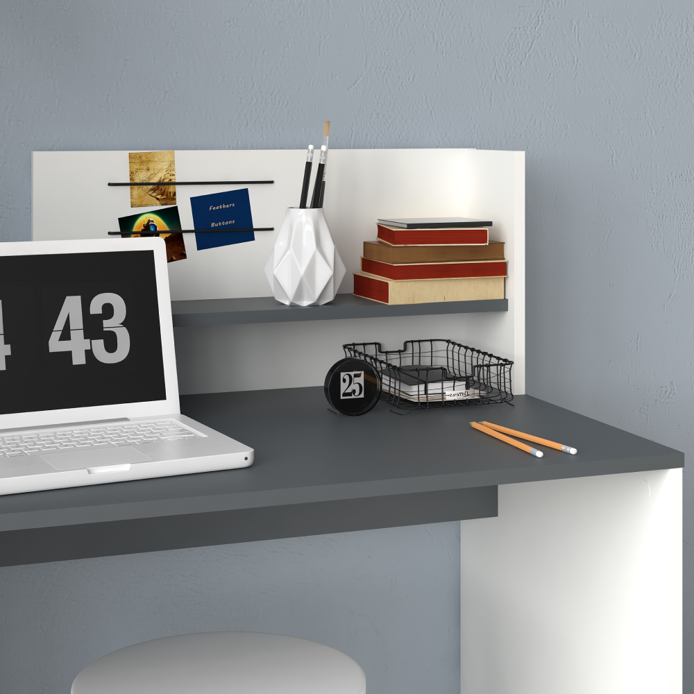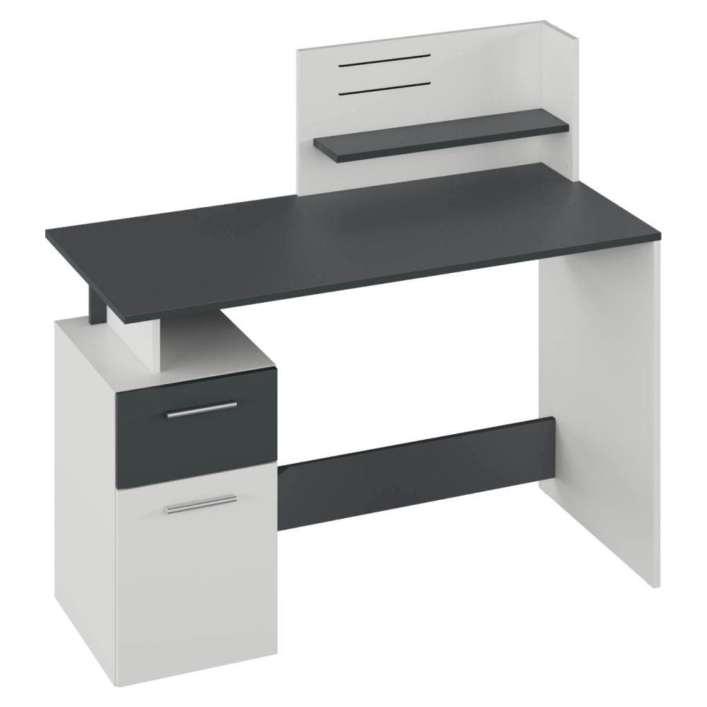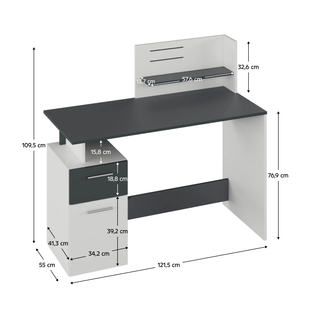 Materiál: laminovaná DTDFarba: biela/grafitCelkové rozmery (ŠxHxV):121,5x55x109,5 cmNosnosť dosky stola: 35 kgRozmery kontajnera (ŠxHxV): 34,2x41,3x58 cmVýška šuplíka: 18,8 cmHrúbka materiálu: 1,6 cmOtvorený úložný priestorS nadstavcomS plastovou úchytkouFarba úchytky: striebornáObsahuje policu, šuplík a regálKvalitný slovenský výrobokNožičky v podobe klzákovDodávané v demonte