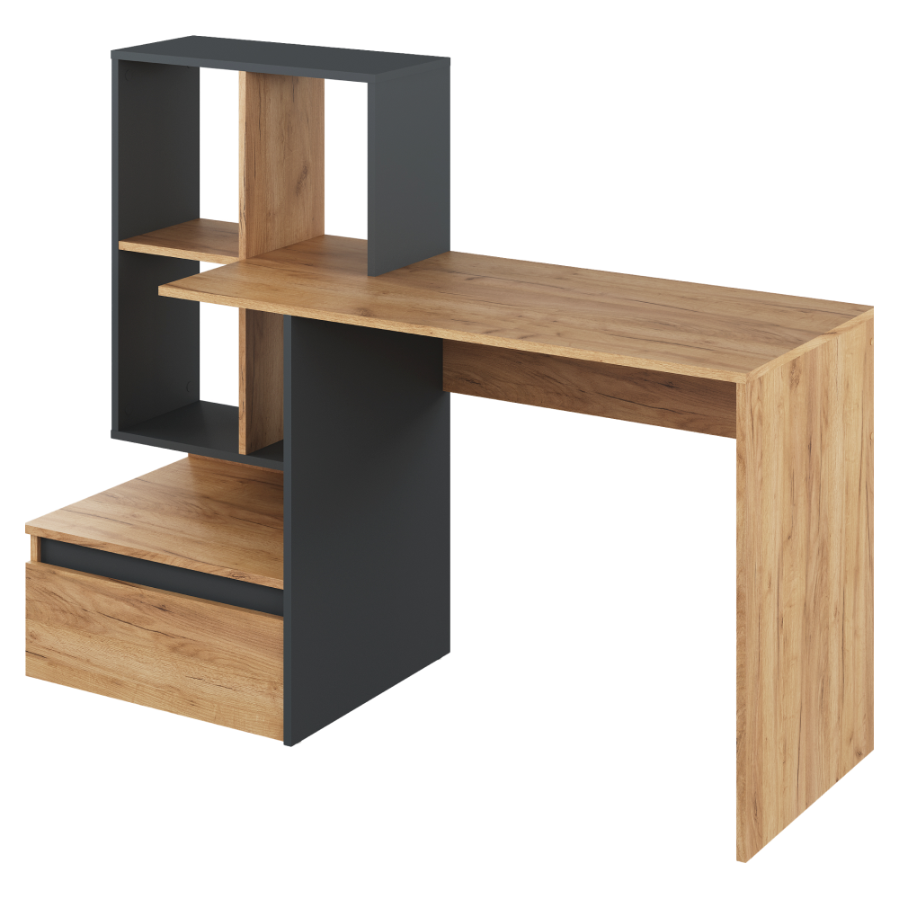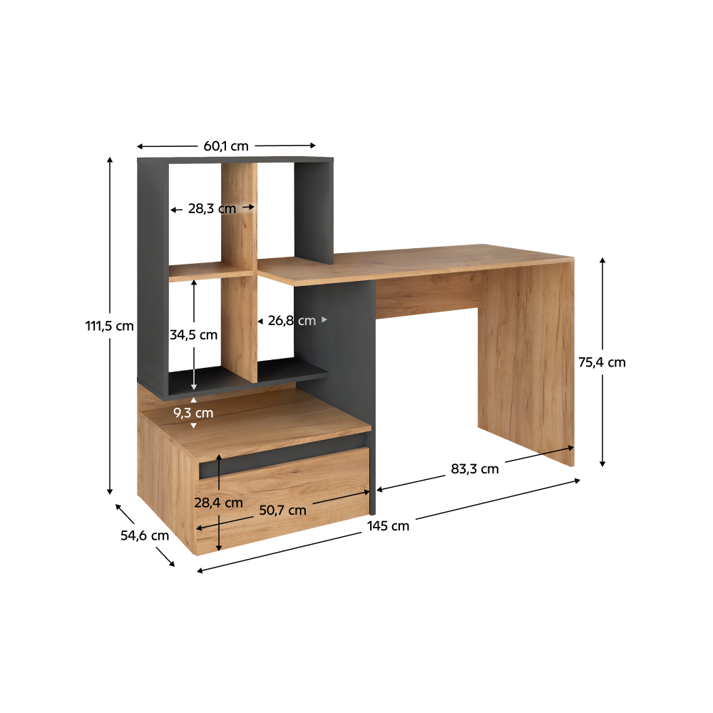 Materiál: DTD laminovanáFarba: dub craft zlatý/grafitRozmery (ŠxHxV): 145x51,6x111,5 cmHrúbka materiálu: 1,6 cmSo zásuvkouNosnosť zásuvky: 5 kgOtvorený úložný priestorRegálPolicaNosnosť na policu: 5 kgNosnosť doky stola: 35 kgBez úchytkyPlastové klzákyKvalitný slovenský výrobokDodávané v demonte
