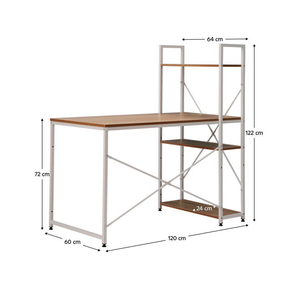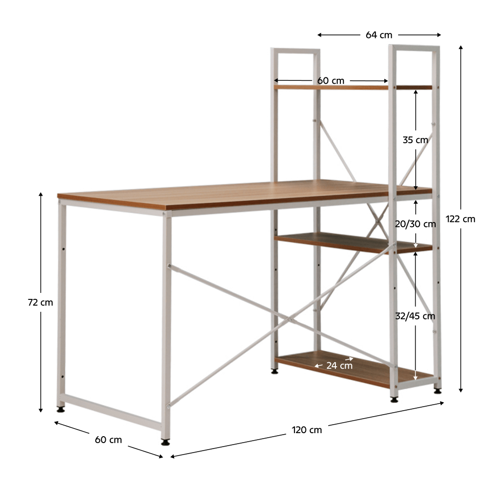 Materiál: DTD laminovaná/kovFarba: dub/bielaRozmery (ŠxHxV): 120x60/64x72/122 cmVýška regálu: 122 cmVýška stola: 72 cmHrúbka materiálu: 16 mmHĺbka políc: 24 cmNosnosť police: 20 kgNosnosť stola: 30 kgTri policeViacúčelový stôlRektifikačné skrutky na noháchDodávané v demonte