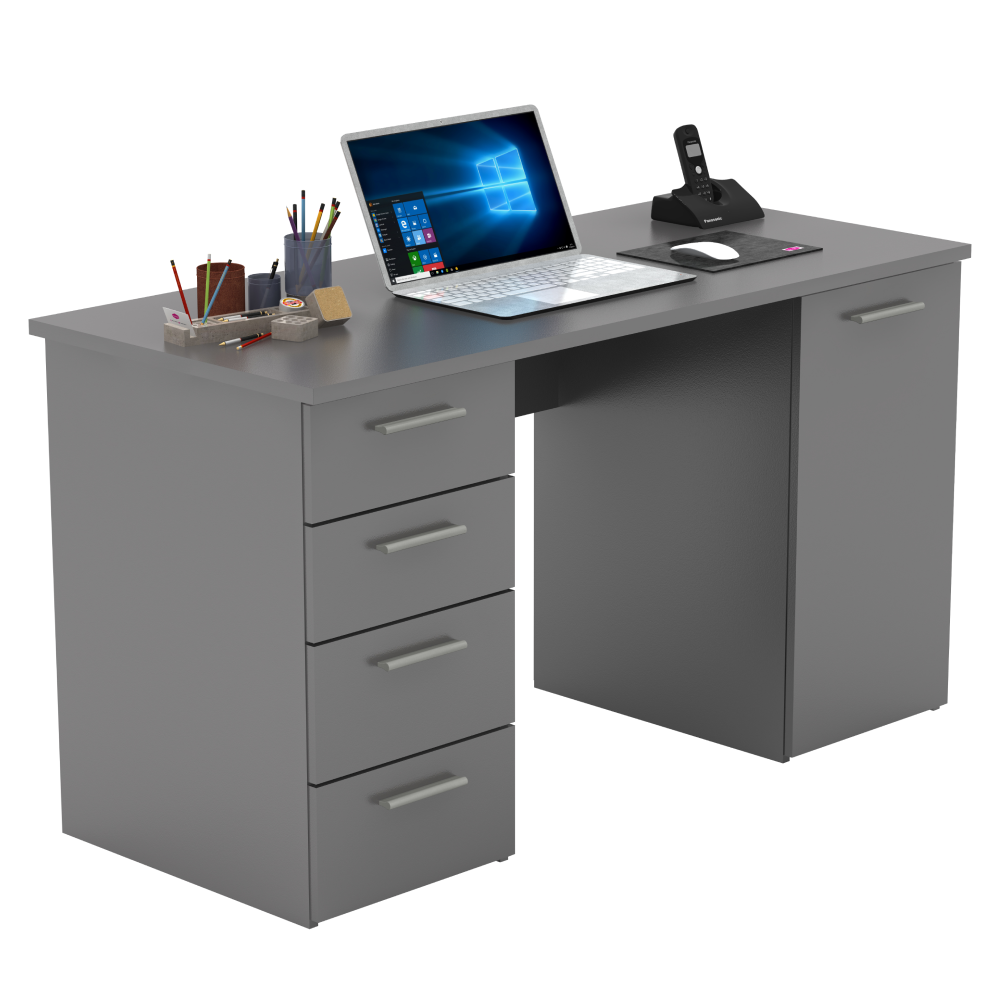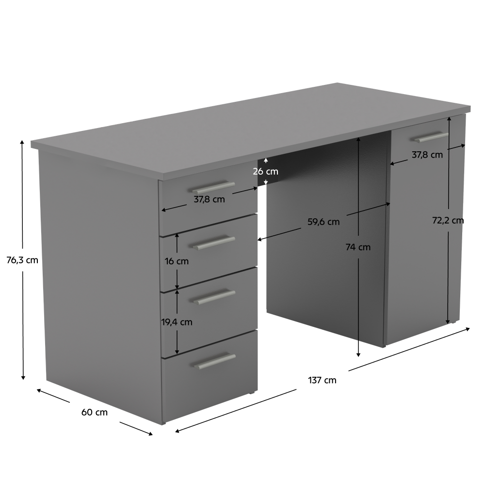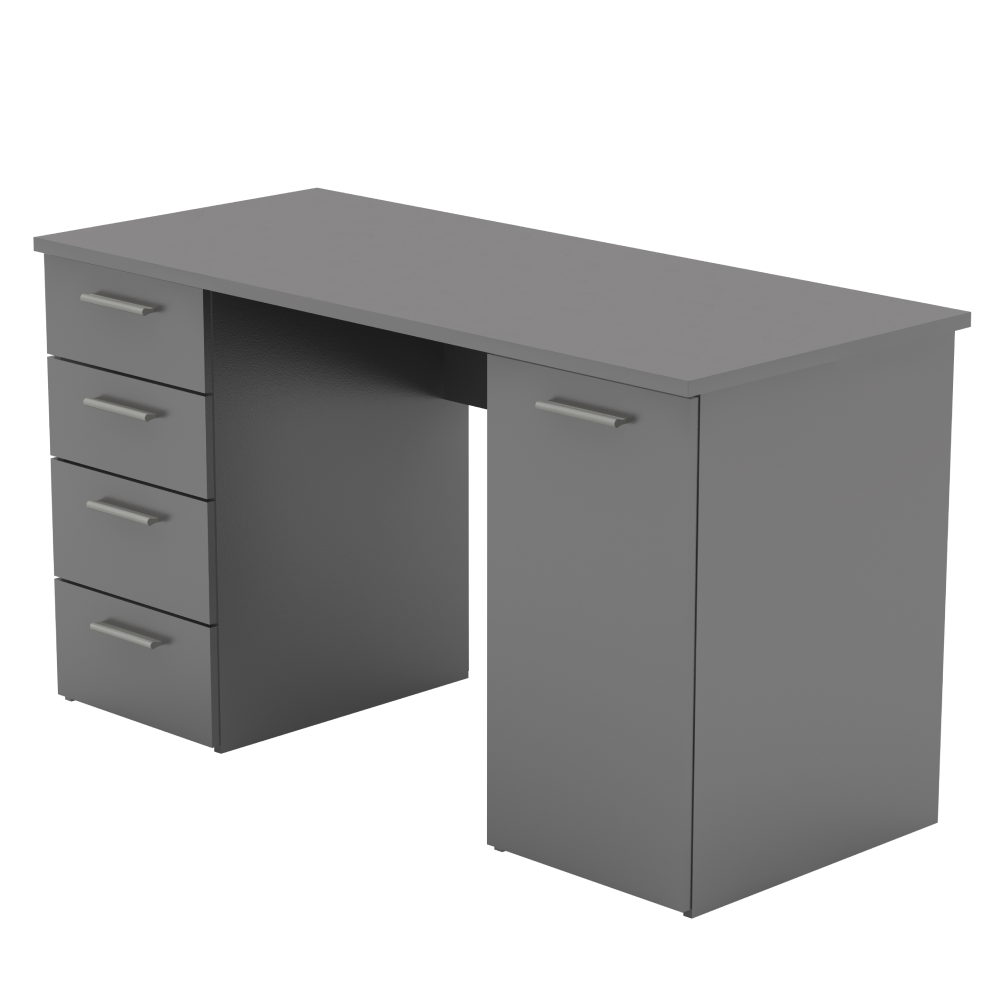 PC stôl EUSTACHMateriál: DTD laminovanáFarba: grafitHrúbka materiálu: 16/22 mmRozmery (ŠxHxV): 137x60x76,3 cmRozmery skrinky (ŠxHxV): 37,8x60x76,3 cmŠtyri šuplíky, jedna skrinkaVýška plytších šuplíkov: 16 cmVýška hlbších šuplíkov: 19,4 cmDodávané v demonteKvalitný slovenský výrobok