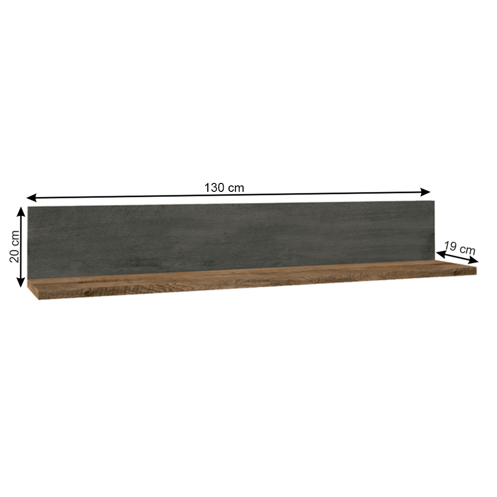 Polica P1, MONTANAMateriál: DTD laminovanáFarebné prevedenie: dub lefkas tmavý/smooth sivýRozmery (ŠxHxV): 130x19x20 cm Hrúbka materiálu: 15 mmDodávané v demonte.