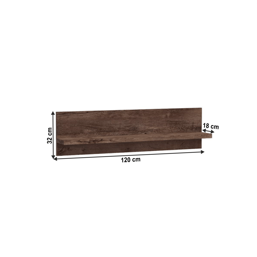 Polica 11 z luxusného sektorového nábytku Korpus hrubý 16/ 48 mm, úchytky kovovéMateriál DTD laminovaná, ABS hrany, farebné prevedenie: jaseň tmavý, Rozmery ŠxHxV: 120x18x32 cm. Dodávané v demonte.
