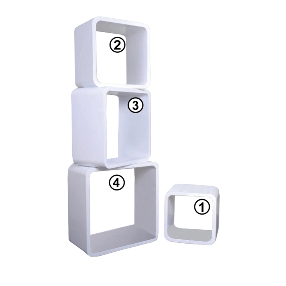 Sada políc - 4 ks, materiál: MDF. Prevedenie: biela. Rozmery ŠxVxH: 1 - 26x26x20 cm, 2 - 31x31x20 cm, 3 - 36x36x20 cm, 4 - 41x41x20 cm. Cena je za sadu políc - 4 ks.