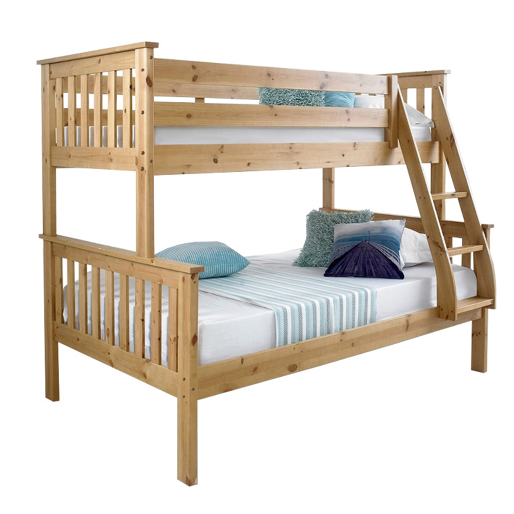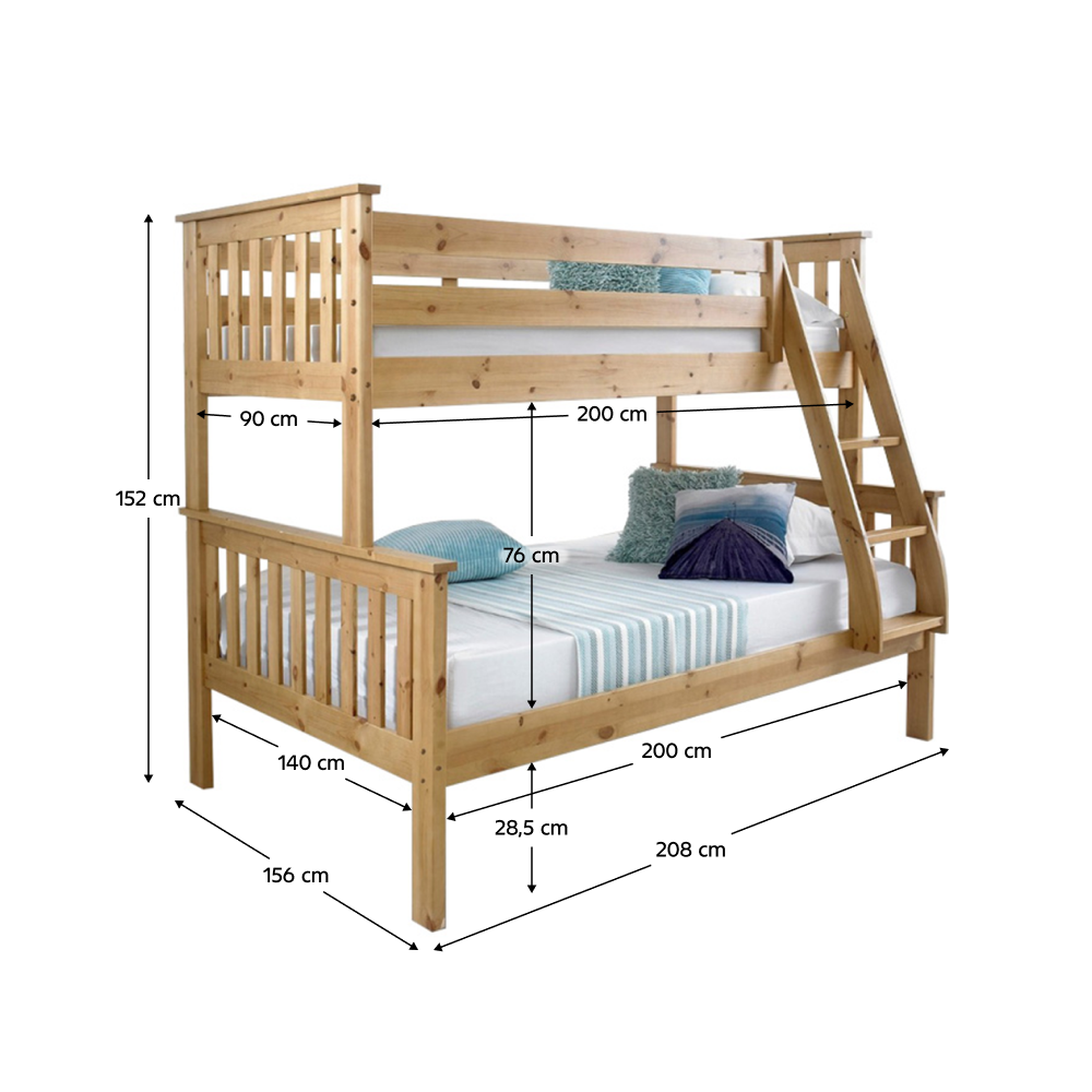 Poschodová rozložiteľná posteľ s roštom LUINIFarba: prírodnáMateriál: borovicové drevo/preglejka (rošt)Rozmery (ŠxHxV): 208x156x152 cmPlocha na spanie dolné lôžko (ŠxH): 140x200 cmPlocha na spanie horné lôžko (ŠxH): 90x200 cmHrúbka materiálu: 20 mmHrúbka materiálu nôh (ŠxH): 30x70 mm Nosnosť horné lôžko: 80 kg Nosnosť spodné lôžko: 100 kgLôžka majú po rozložení odlišnú výškuDodávané s roštom.Dodávané bez matraca.Možnosť dokúpiť matrac s našej ponuky.Dodávané v demonte.Vhodná aj pre 3 ľudí
