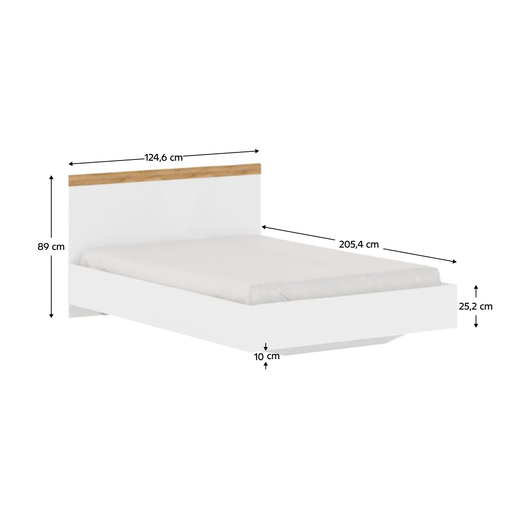 Materiál: DTD laminovaná/ABS hranyFarba: biela/dub wotanRozmery (ŠxHxV): 124,6x205,4x89 cmPlocha na spanie (ŠxD): 120x200 cmNosnosť: 90 kgOdporúčaná výška matraca : min 9 cmHrúbka materiálu: 1,6 - 2,2 cmVýška spodného priestoru od podlahy: 10 cmVýška bočnice: 25,2 cmBez úložného priestoruDodávané bez matraca a roštuMožnosť dokúpiť rošt a matrac z našej ponuky Len na objednávkuDodacia lehota je 3-5 týždňovDodávané v demonte
