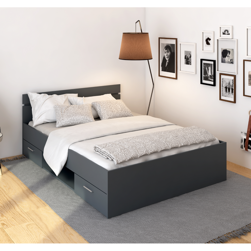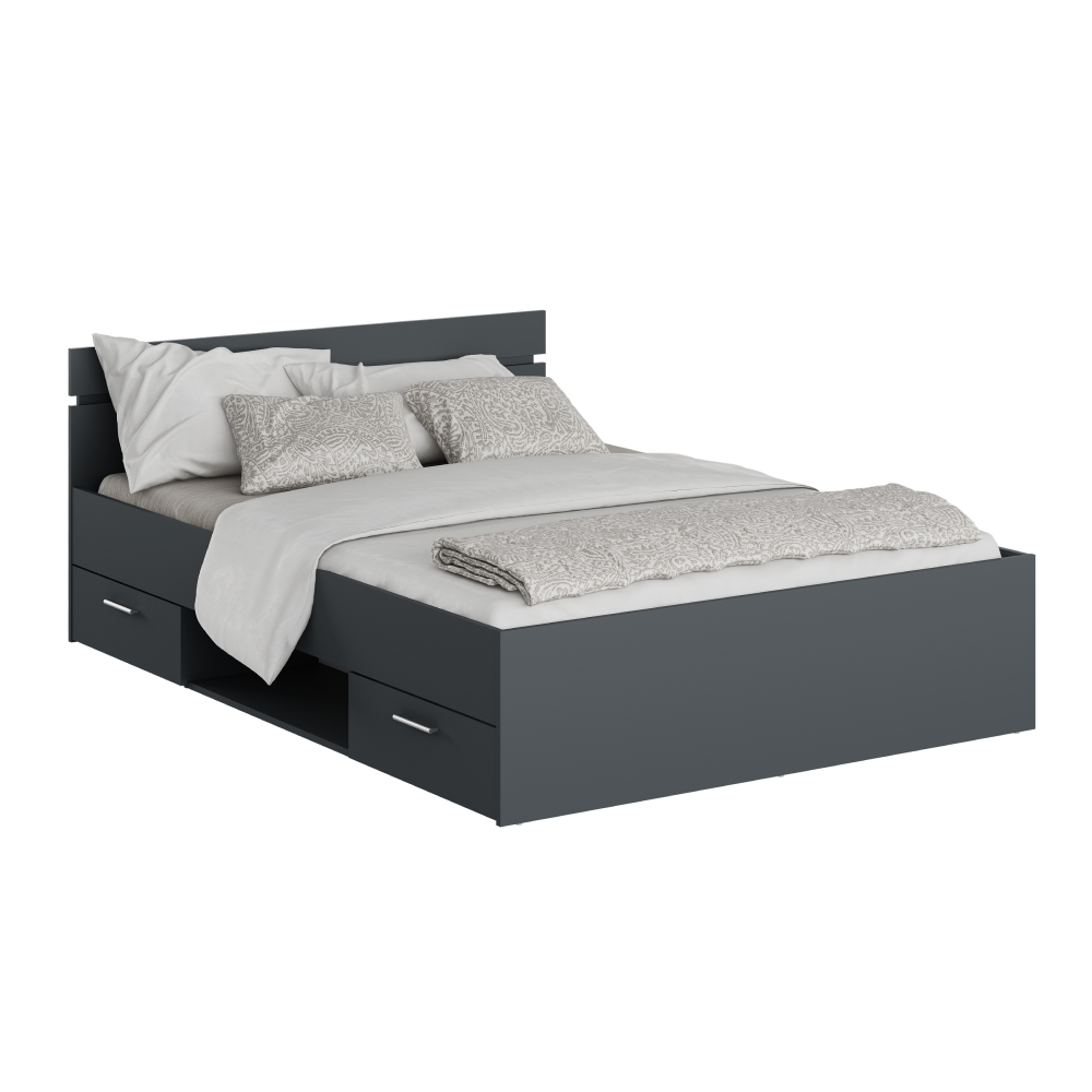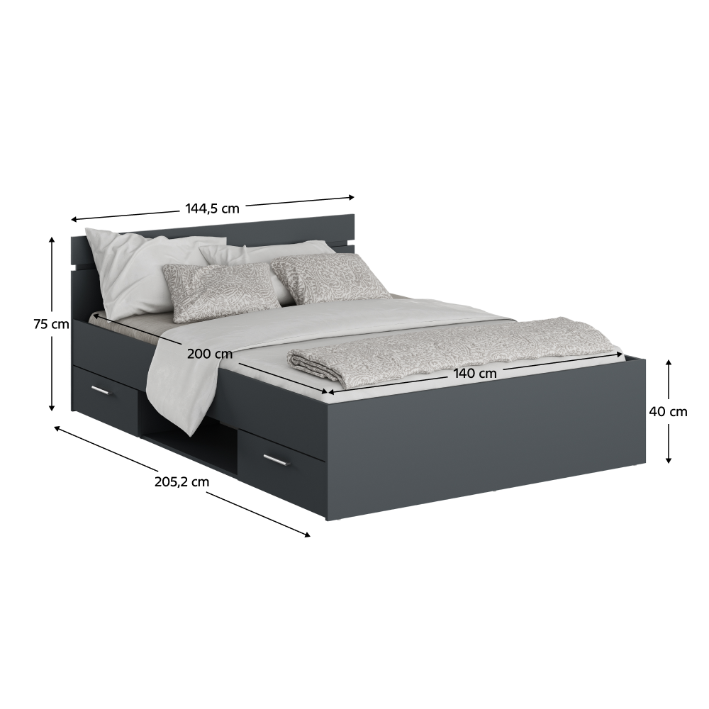 Posteľ MICHIGAN NEW so šuplíkmi a s odkladacím priestorom.Materiál: DTD laminovaná.Farebné prevedenie: grafitRozmery (ŠxHxV): 144,5x205,2x75 cmPlocha na spanie: 140x200 cm.Výška spania: 40 cmVýška po rošt: 26 cmVýška matraca: 15 cm Nosnosť: 2x100 kgŠírka čelnej dosky šuplíka: 60 cmHrúbka čelnej dosky šuplíka: 1,5 cmVnútorný rozmer šuplíka s rámom (ŠxH): 58x35 cmÚložný priestor šuplíka (ŠxH): 55,5x33,5 cmVýška vnútorného priestoru šuplíka: 10,5 cmOba šuplíky sú rovnakej veľkostiK posteli je možné zakúpiť rošt v pevnom ráme 140x200 a matrac s rozmerom 140x200 cm na základe našej ponuky.