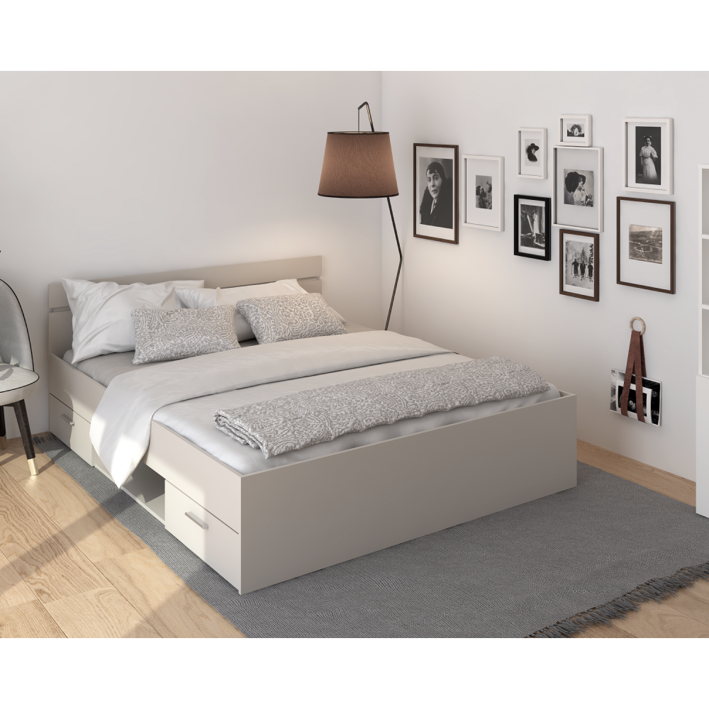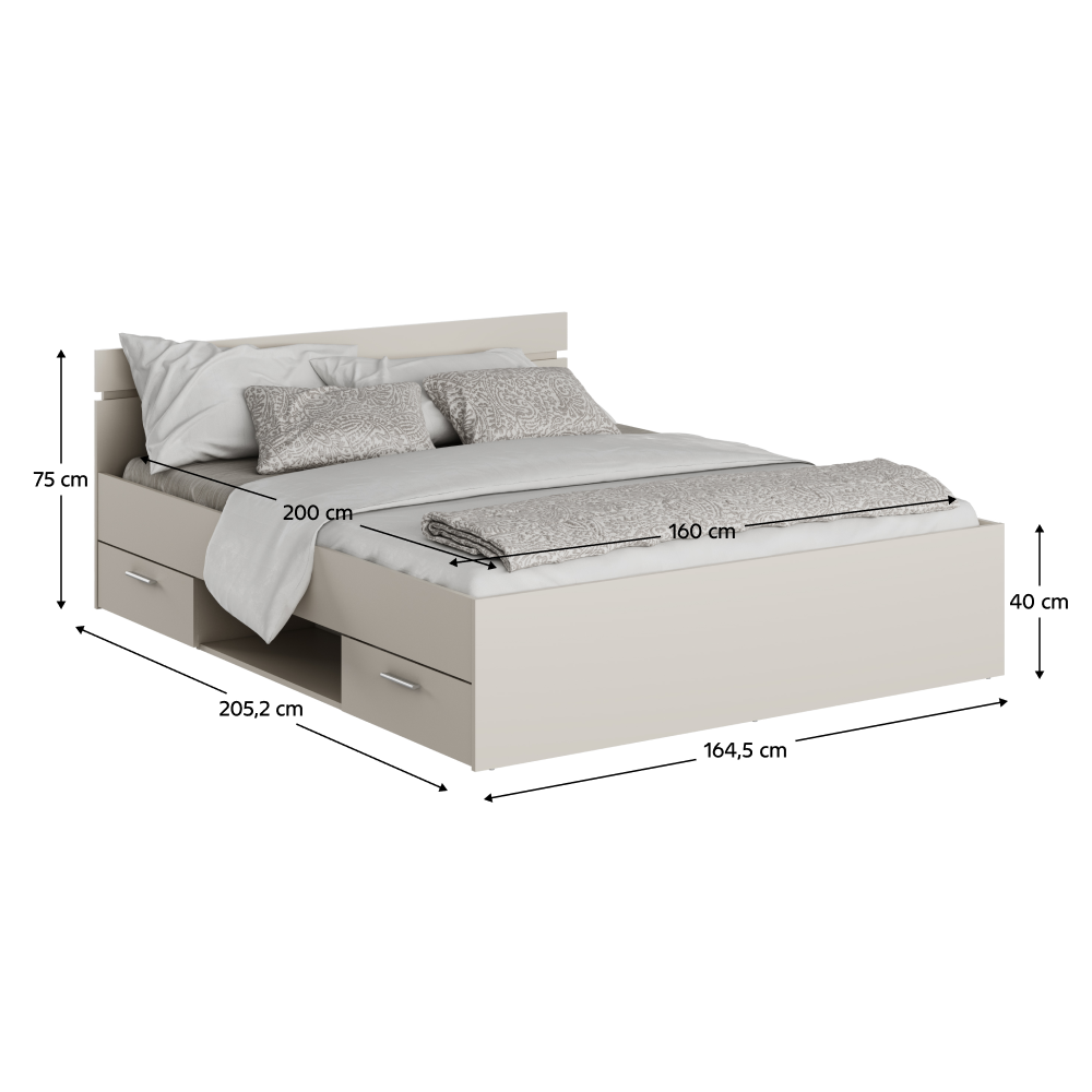 Materiál: DTD laminovanáFarba: cashmereRozmery (ŠxHxV): 164,5x205,2x75 cmPlocha na spanie (ŠxD): 160x200 cmVýška spania: 40 cmVýška po rošt: 26 cmVýška matraca: 15 cmNosnosť na osobu: 100 kgDve zásuvkyZásuvky viete namontovať z pravej alebo ľavej stranyS odkladacím priestoromMožnosť dokúpiť rošt v pevnom rámeMožnosť dokúpiť matracDodávané v demonte
