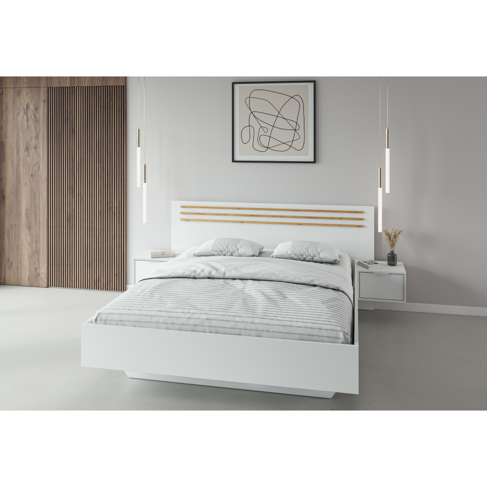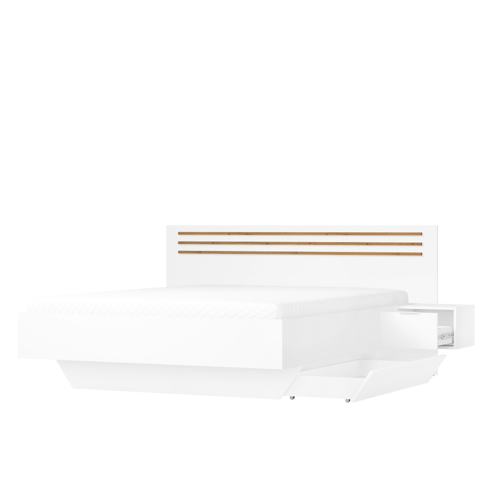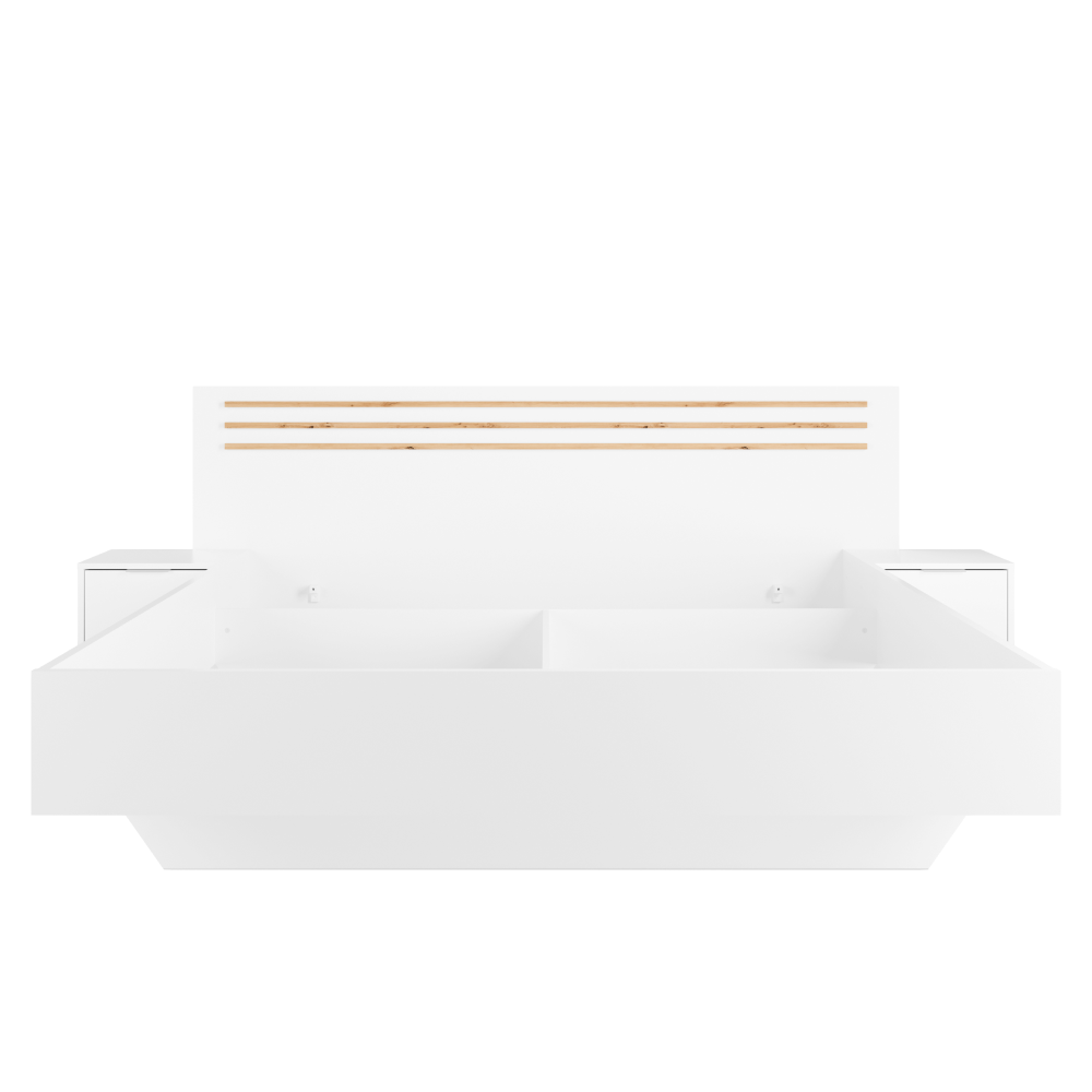 Materiál: DTD laminovaná/MDF/ABS hranyFarba: biela/dub artisanRozmery (ŠxHxV): 245,2x204x95,2 cmPlocha na spanie (ŠxD): 160x200 cmHrúbka materiálu: 1,6 cmNosnosť na osobu: 110 kgVýška po rošt: 34,9 cm2 nočné stolíkyNosnosť nočného stolíka: 20 kgÚložný priestorZapustenie matraca: 10,8 cmDodávaná bez roštuOdporúčame zakúpiť rošt STELAR z našej ponukyDodávaná bez matracaMožnosť dokúpiť matrac z našej ponukyOdporúčaná minimálna výška matraca: 15 cmOzdobné lamelyModerný dizajnDodávané v demonte