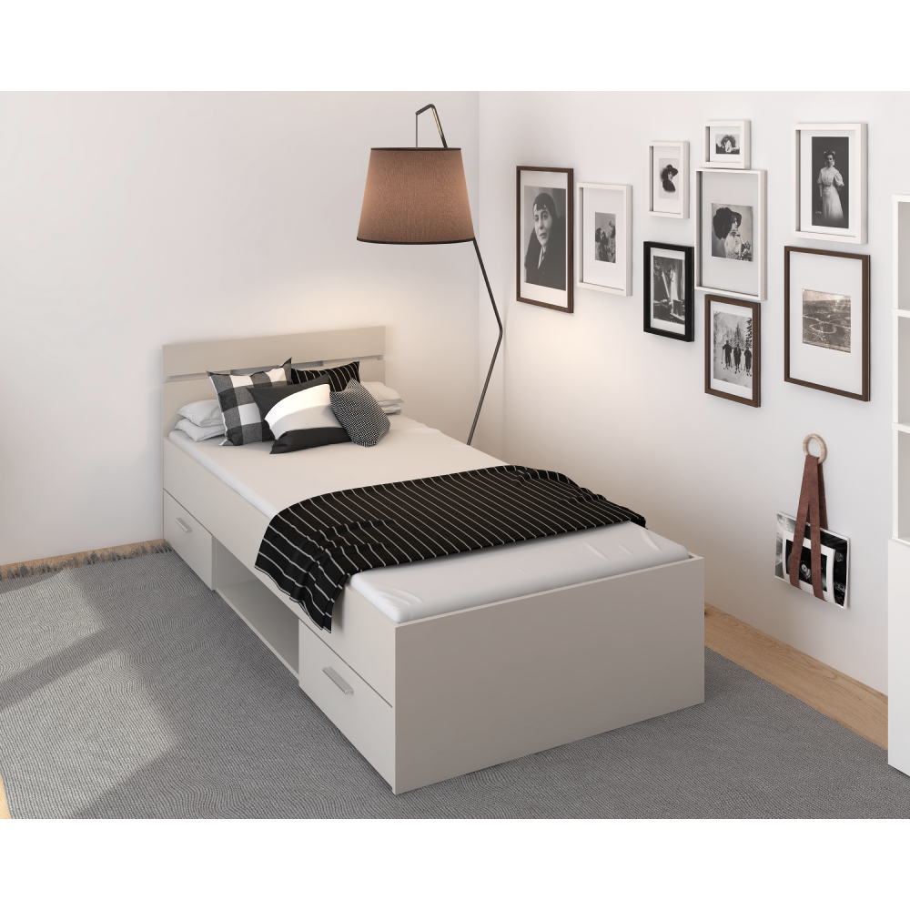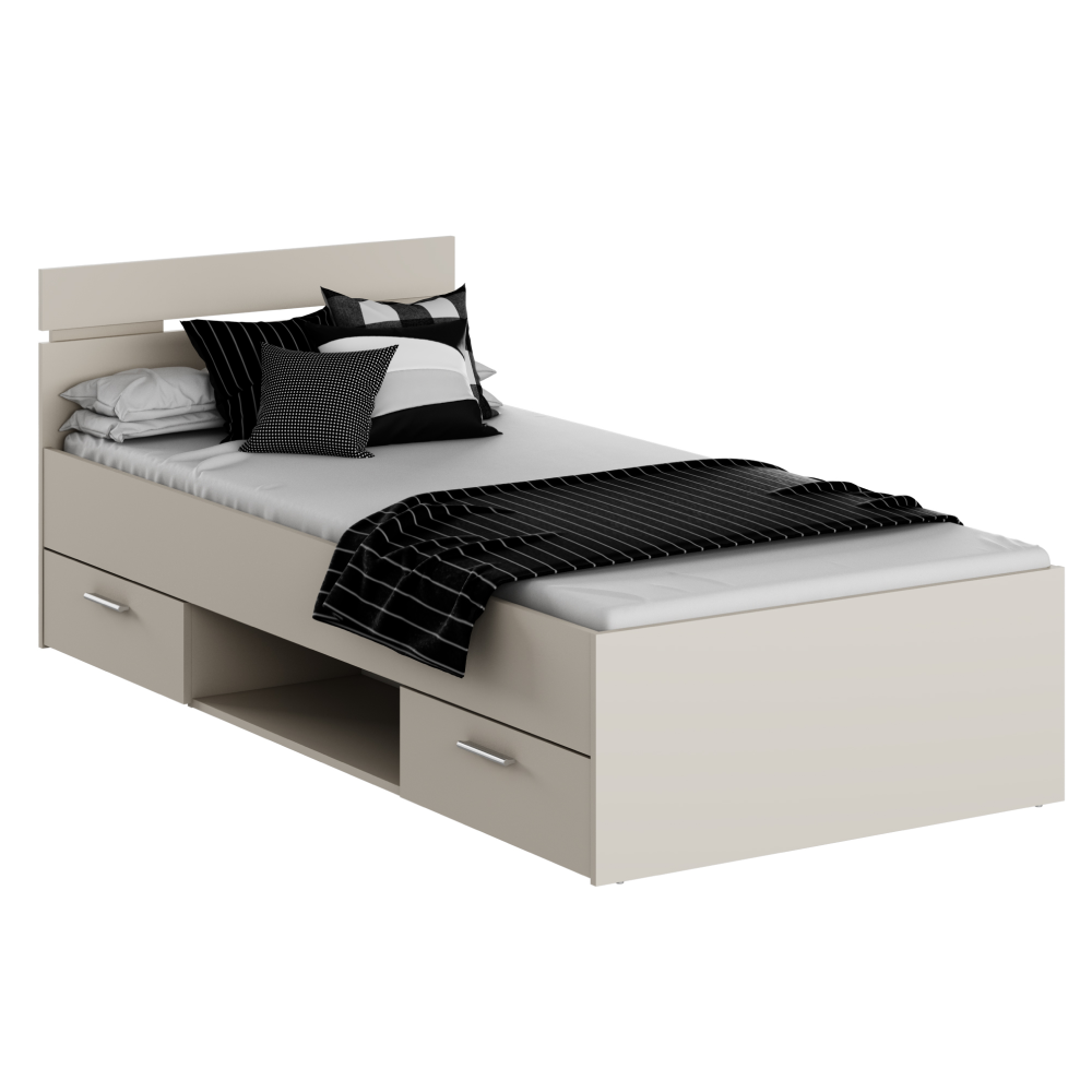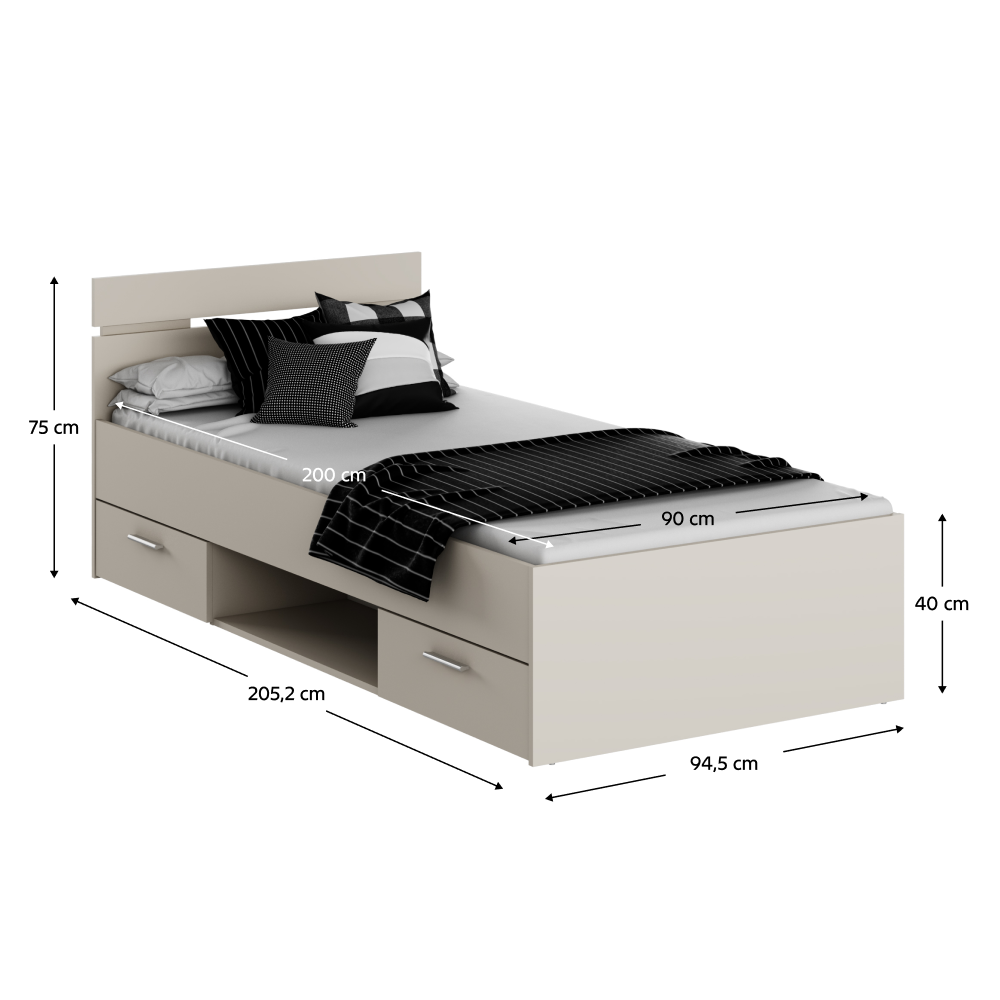 Materiál: DTD laminovanáFarba: cashmereRozmery (ŠxHxV): 94,5x205,2x75 cmVnútorné rozmery šuplíka (ŠxHxV): 55,5x33,5x11 cmPlocha na spanie (ŠxD): 90x200 cmVýška spania: 40 cmVýška po rošt: 26 cmVýška matraca: 15 cmNosnosť: 100 kgDva šuplíkyŠuplíky viete namontovať z pravej alebo ľavej stranyS odkladacím priestoromMožnosť dokúpiť rošt v pevnom rámeMožnosť dokúpiť matracDodávané v demonte