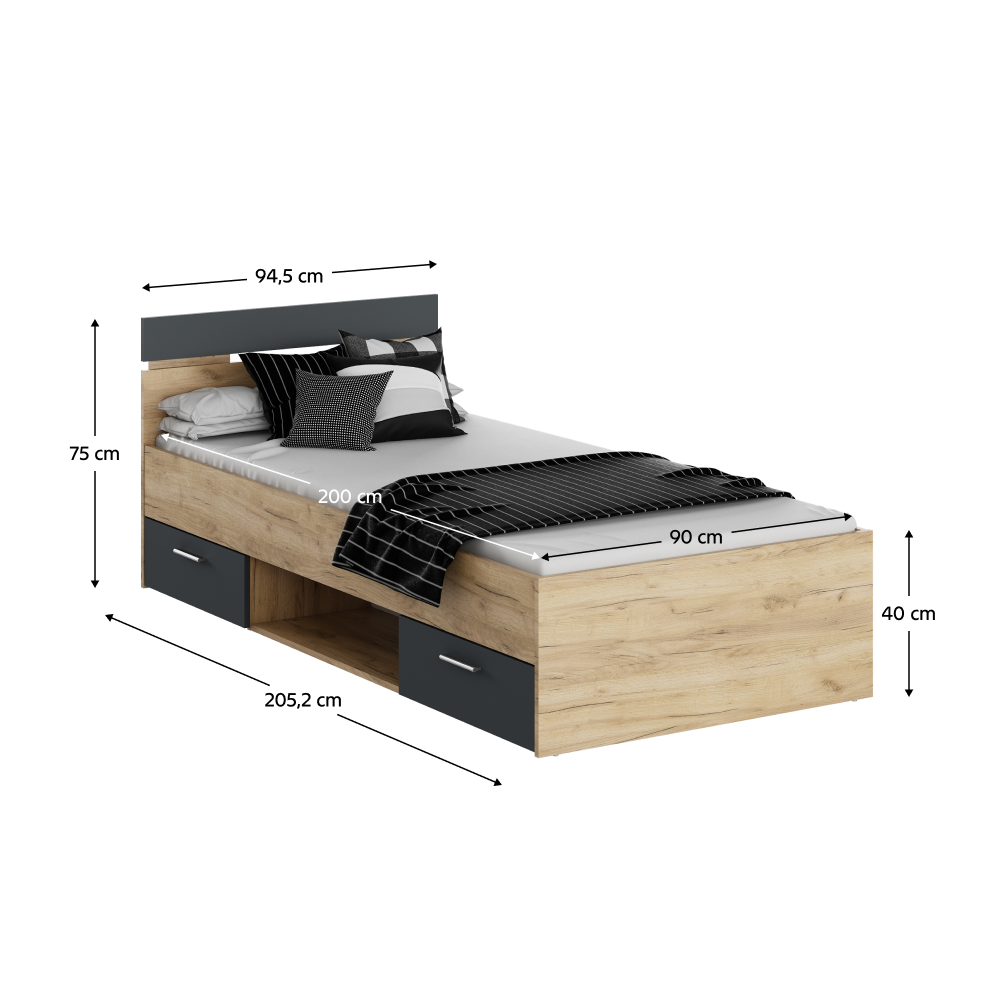 Posteľ MICHIGAN NEW so šuplíkmi a s odkladacím priestorom.Materiál: DTD laminovaná.Farebné prevedenie: dub artisan/grafitRozmery (ŠxHxV): 94,5x205,2x75 cm.Vnútorné rozmery šuplíka (ŠxHxV): 55,5x33,5x11 cmPlocha na spanie: 90x200 cmVýška spania: 40 cmVýška po rošt: 26 cmVýška matraca: 15 cm K posteli je možné zakúpiť rošt v pevnom ráme 90x200 a matrac s rozmerom 90x200 cm na základe našej ponuky.Nosnosť na osobu: 100 kg
