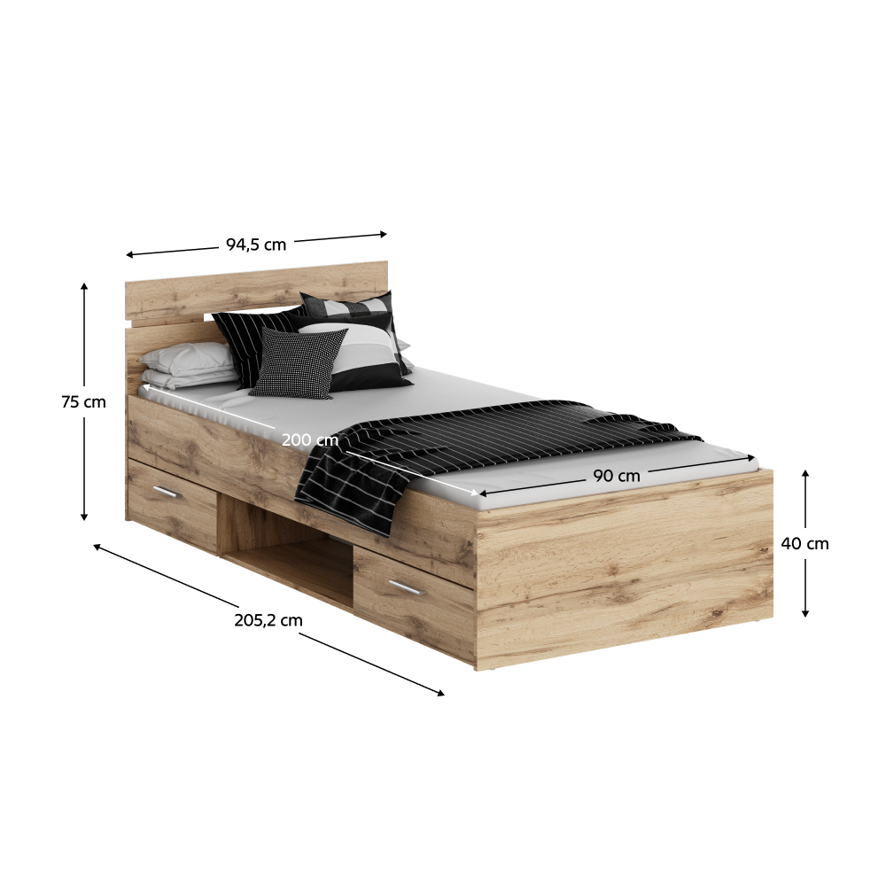 Posteľ MICHIGAN NEW so šuplíkmi a s odkladacím priestorom.Materiál: DTD laminovaná.Farebné prevedenie: dub wotanRozmery (ŠxHxV): 94,5x205,2x75 cm.Vnútorné rozmery šuplíka (ŠxHxV): 55,5x33,5x11 cmPlocha na spanie: 90x200 cmVýška spania: 40 cmVýška po rošt: 26 cmVýška matraca: 15 cm K posteli je možné zakúpiť rošt v pevnom ráme 90x200 a matrac s rozmerom 90x200 cm na základe našej ponuky.Nosnosť na osobu: 100 kg