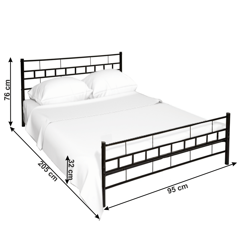 Materiál: kovFarba: čiernaRozmery (ŠxHxV): 95x205x76 cmPlocha na spanie (ŠxH): 90x200 cm Nosnosť: 100 kgVýška po rošt : 32 cm Kovové čeláDodávané bez matracaMožnosť zakúpiť matrace z našej ponukyDodávané v demonte