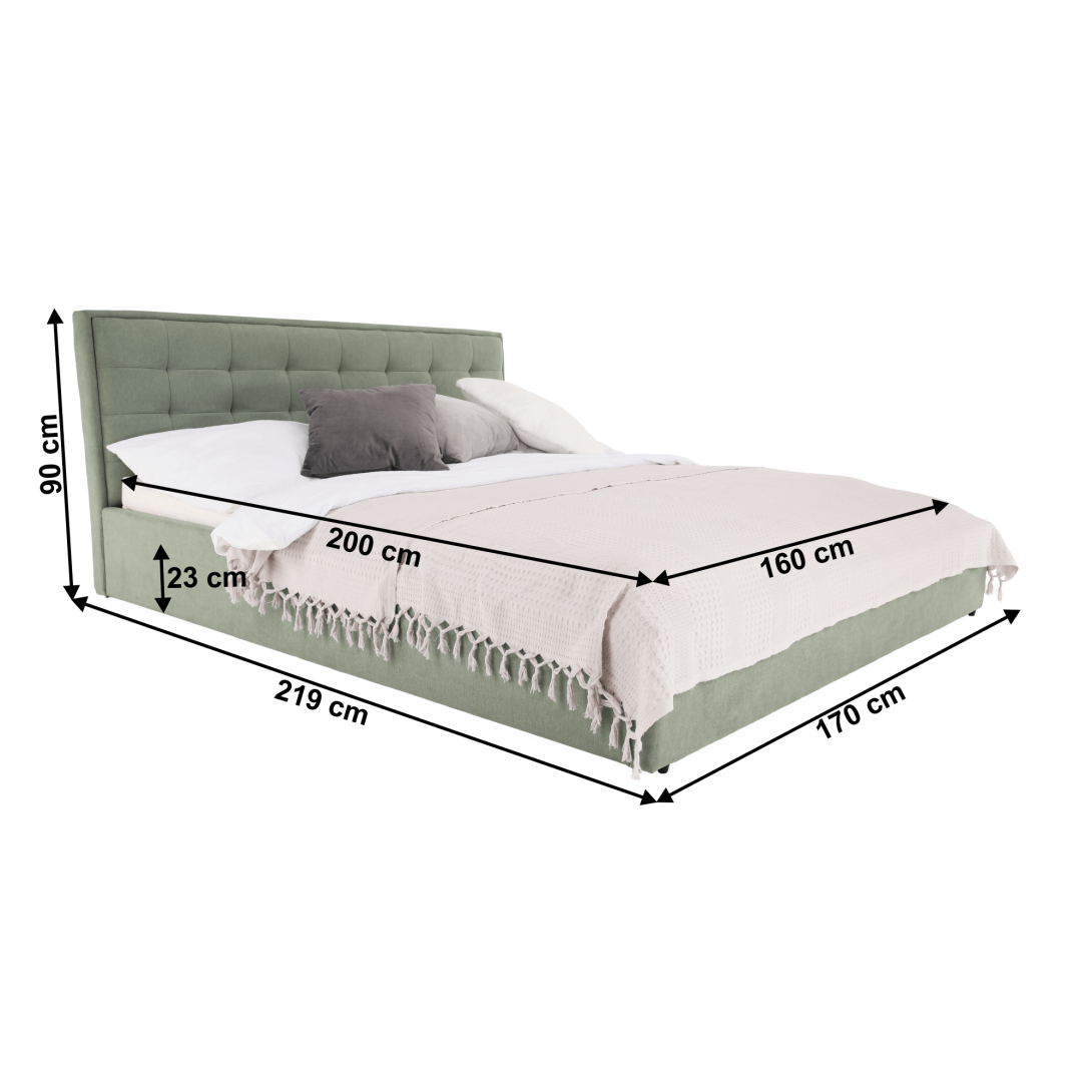 Materiál: látkaOderuodolnosť textílie podľa testu Martindale: 100 000 oderovFarba: mentolováRozmery (ŠxHxV): 170x219x90 cmPlocha na spanie (ŠxH): 160x200 cmVýška po rošt : 23 cmZapustenie roštu: 4 cmDodávané s lamelovým roštomNosnosť na jedno lôžko: 110 kgÚložný priestorPrešívané čeloDodávané bez matracaMožnosť zakúpiť matrace z našej ponukyDodávané v demonte
