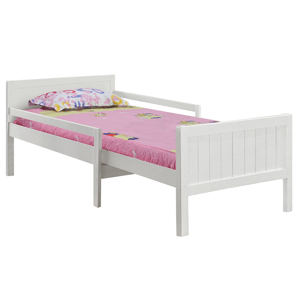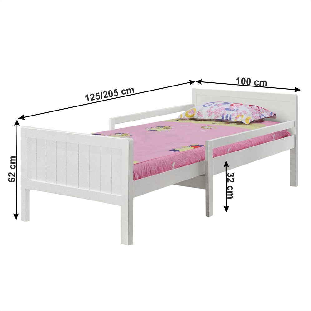 Materiál: borovicový masív/MDFFarba: bielaRozmery (ŠxHxV): 125/205x100x62 cmRozmery lôžka (ŠxH): 90x120/150/170/200 cmVýška po rošt: 32 cmMax. výška matraca: 10 cmNosnosť: 90 kgNastaviteľná dĺžka posteleSo zábranou proti páduS preglejkovým rolovaným roštomDodávané bez matracaMožnosť zakúpiť matrac z našej ponukyDodávané v demonte