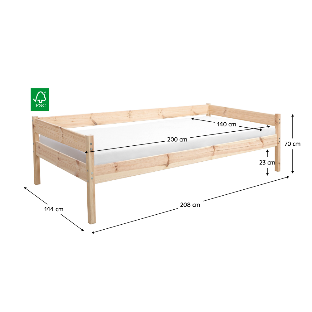 Materiál: smrekFarba: prírodnáRozmery (ŠxHxV): 200x144x70 cmPlocha na spanie (ŠxH): 140x200 cmHrúbka materiálu: 1,8 cmNosnosť na lôžko: 100 kgNa nožičkáchVýška nožičiek: 23 cmHrúbka materiálu nohy: 4 cmDodávaná s latkovým roštomPočet lát: 15Dodávané bez matracaMožnosť zakúpiť matrace z našej ponukyOdporúčaná výška matraca: 15 cmPosteľ je dodávaná bez úložného boxu a prístelkyMožnosť zakúpiť úložný box a prístelku BENY z našej ponukyBez povrchovej úpravyKvalitný slovenský výrobokDodávané v demonte