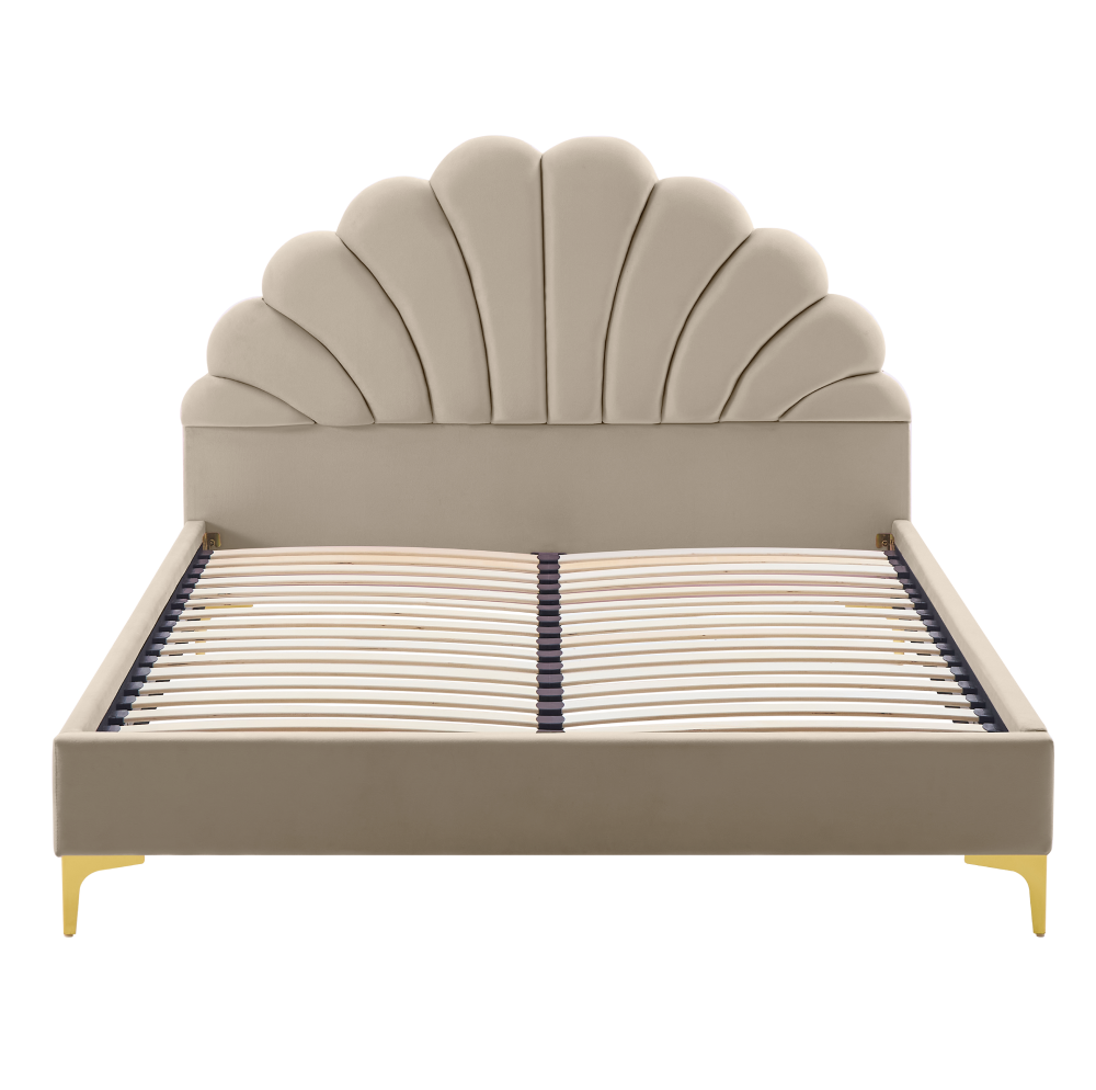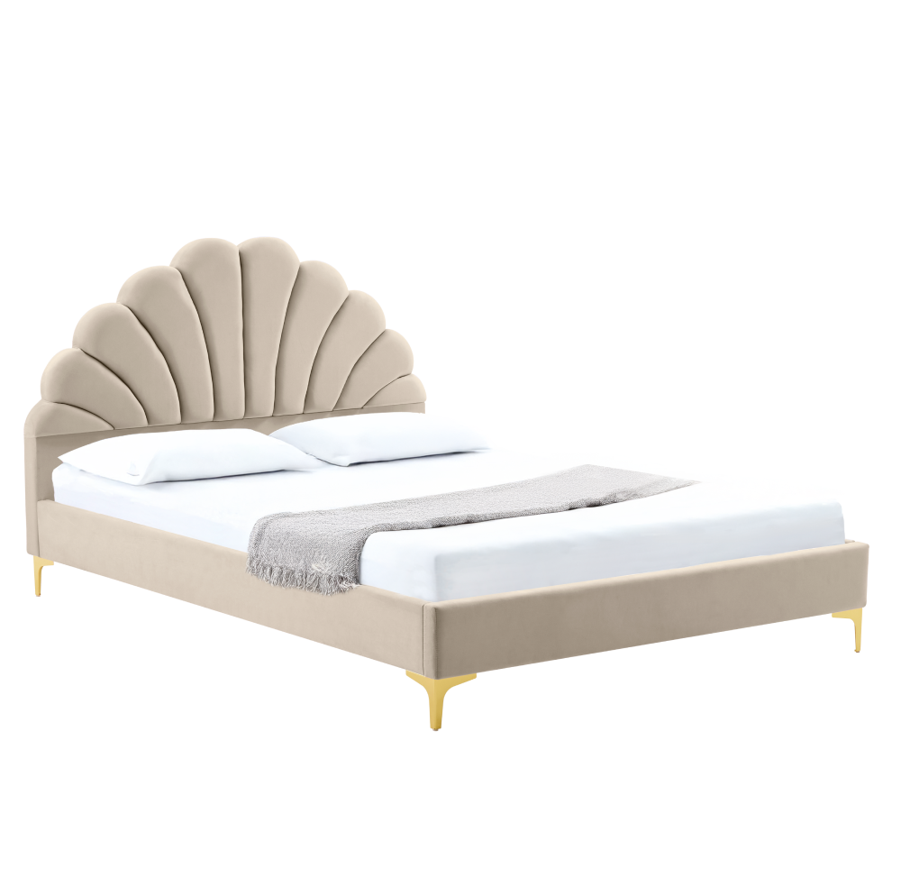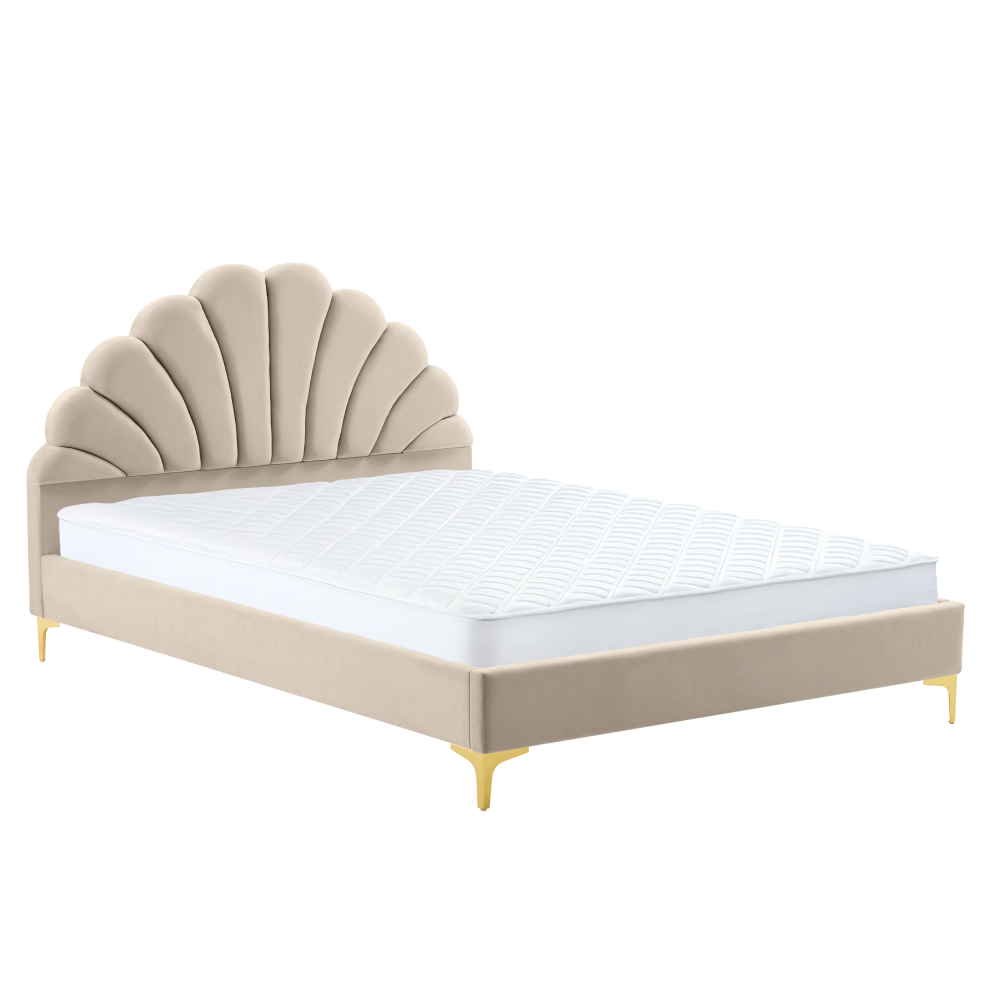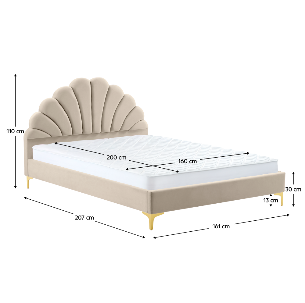 Materiál: Velvet látka/MDF/drevotrieskaOderuodolnosť textílie podľa testu Martindale: 25 000-30 000 oderovFarba: béžováRozmery (ŠxHxV): 161x207x110 cmPlocha na spanie (ŠxD): 160x200 cmVýška po rošt: 27 cmVýška bočnice: 30 cmNosnosť na osobu: 110 kgDekoratívne prešívané čelo v tvare mušleNa nožičkáchMateriál nožičiek: kovFarba nožičiek: zlatáVýška nožičiek: 13 cmDodávaná s lamelovým roštomPriestor medzi lamelami: 5,5 cmDodávaná bez matracaOdporúčame zakúpiť matrac z našej ponukyZapustenie matraca: 3 cmOdporúčaná výška matraca: 20 cmElegantnáČalúnenáDodávané v demonte