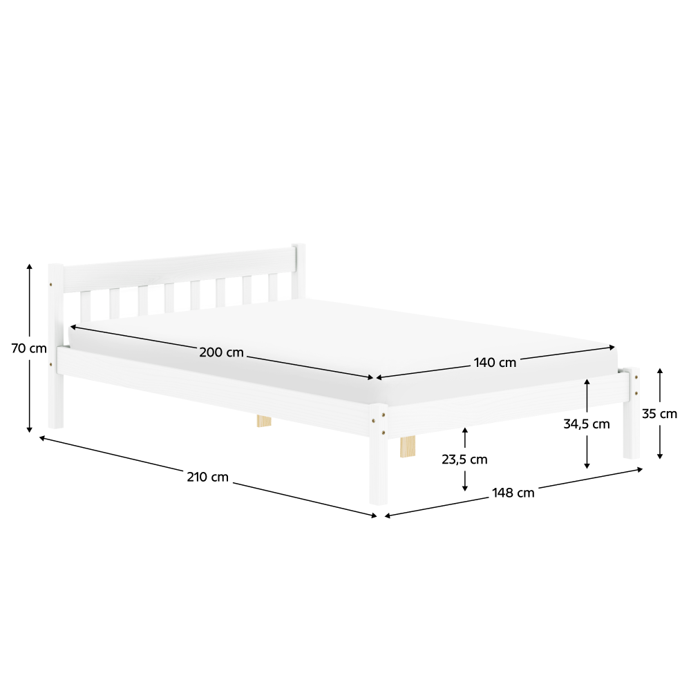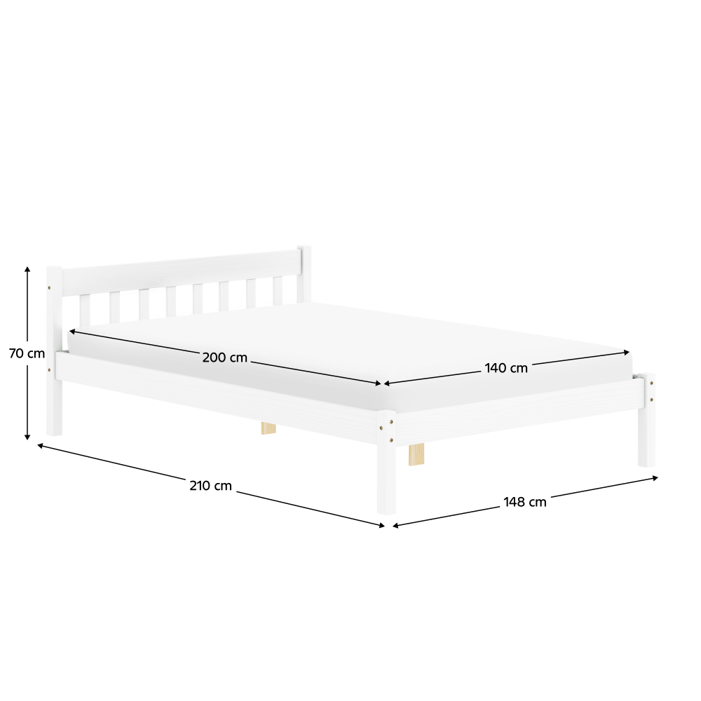 Materiál: masívne borovicové drevoFarba: bielaRozmery (ŠxHxV): 148x210x70 cmPlocha na spanie (ŠxD): 140x200 cmHrúbka materiálu: 2,5 cmNosnosť na lôžko: 110 kgVýška po rošt: 29 cmVýška bočnice: 35 cmNa nožičkáchVýška nožičiek: 36 cmHrúbka materiálu nohy: 5x5 cmDodávaná s lamelovým roštomPočet lamiel: 14 ksRozostup medzi lamelami: 7,5 cmHrúbka materiálu lamely: 2 cmDodávané bez matracaMožnosť zakúpiť matrace z našej ponukyOdporúčaná výška matraca: 14 cmZapustenie matraca: 6 cmJednoduchý dizajnDodávané v demonte