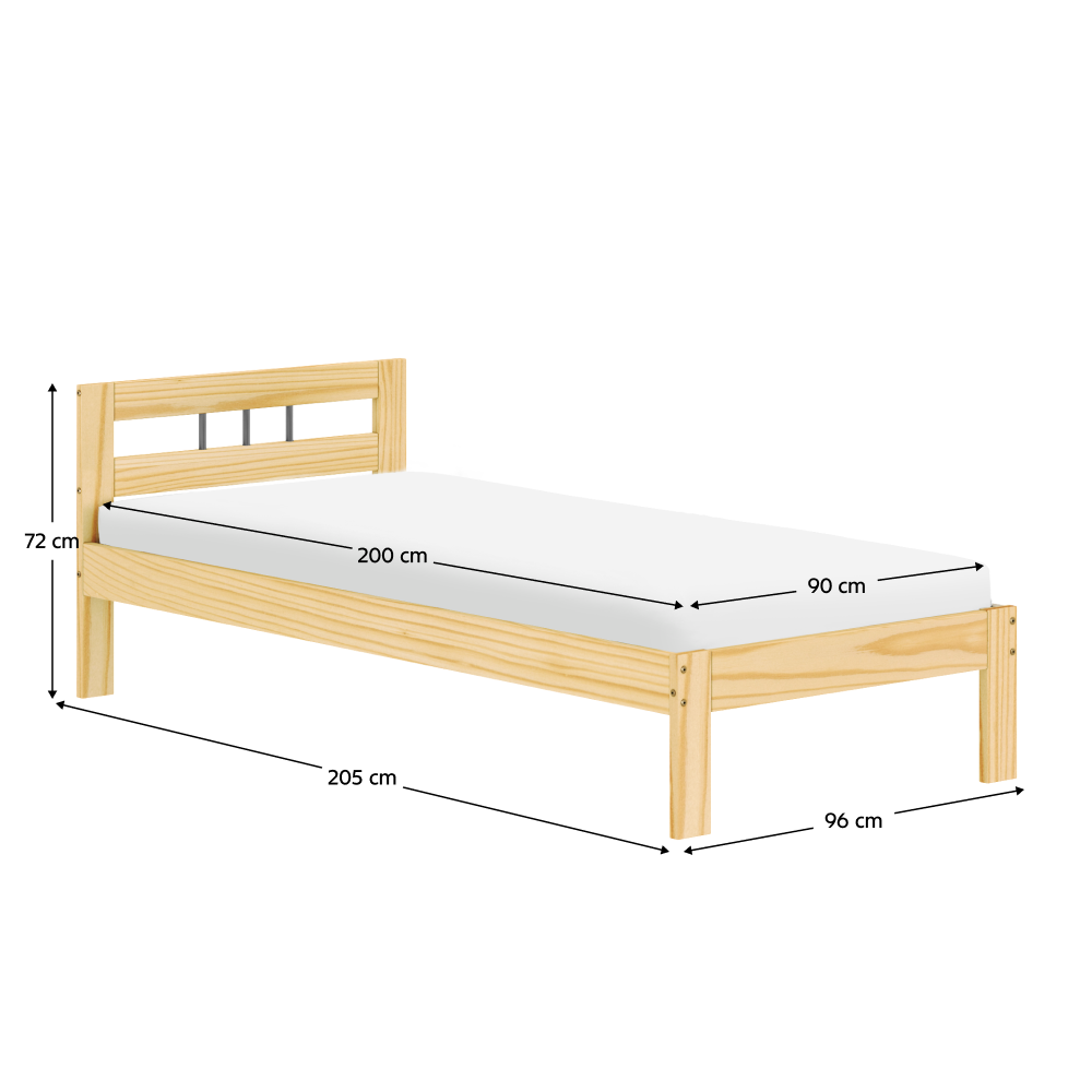 Materiál: masívne borovicové drevoFarba: prírodnáRozmery (ŠxHxV): 96x205x72 cmPlocha na spanie (ŠxD): 90x200 cmHrúbka materiálu: 2,6 cmNosnosť na lôžko: 110 kgVýška po rošt: 28,6Výška bočnice: 35,8Na nožičkáchVýška nožičiek: 36 cmHrúbka materiálu nohy: 2,6 cmDodávaná s lamelovým roštomPočet lamiel: 14 ksRozostup medzi lamelami: 7,5 cmHrúbka materiálu lamiel: 2 cmDodávané bez matracaMožnosť zakúpiť matrace z našej ponukyOdporúčaná výška matraca: 14 cmZapustenie matraca: 7,2 cmJednoduchý dizajnDodávané v demonte