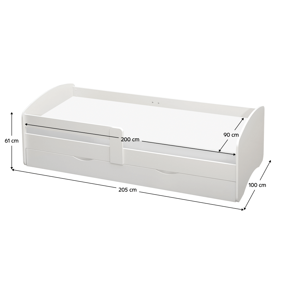 Materiál: laminovaná DTDFarba: bielaRozmery (ŠxHxV): 205x100x61 cmRozmery spania (ŠxD): 90x200 cmHrúbka materiálu: 1,8 cmMožnosť namontovať zábranu na ľavú alebo pravú stranuModerná a praktickáS úložným priestoromÚložný priestor na kolieskachDva šuplíkyHmotnosť: 55 kgNosnosť: 90 kgDodávaná s lamelovým roštomDodávaná bez matracaMožnosť dokúpiť matrac z našej ponukyDodávaná v demonte