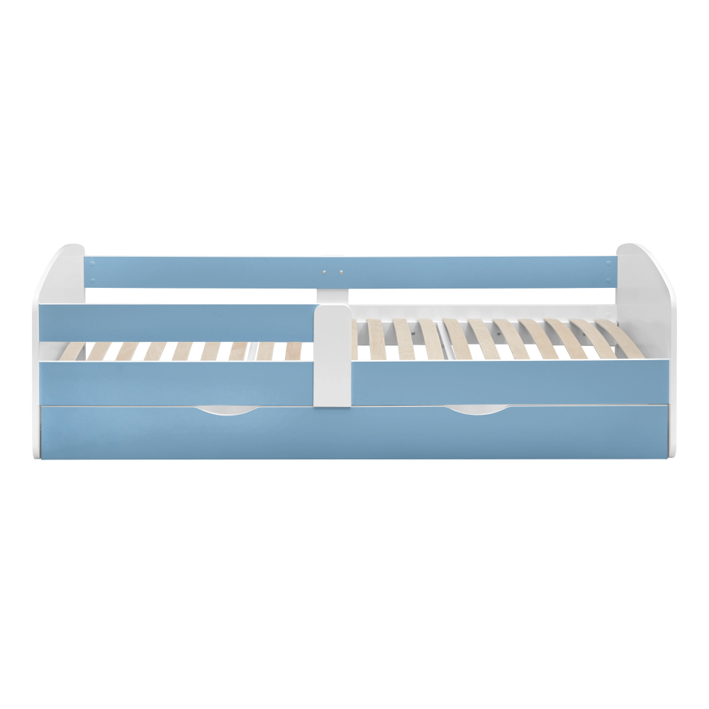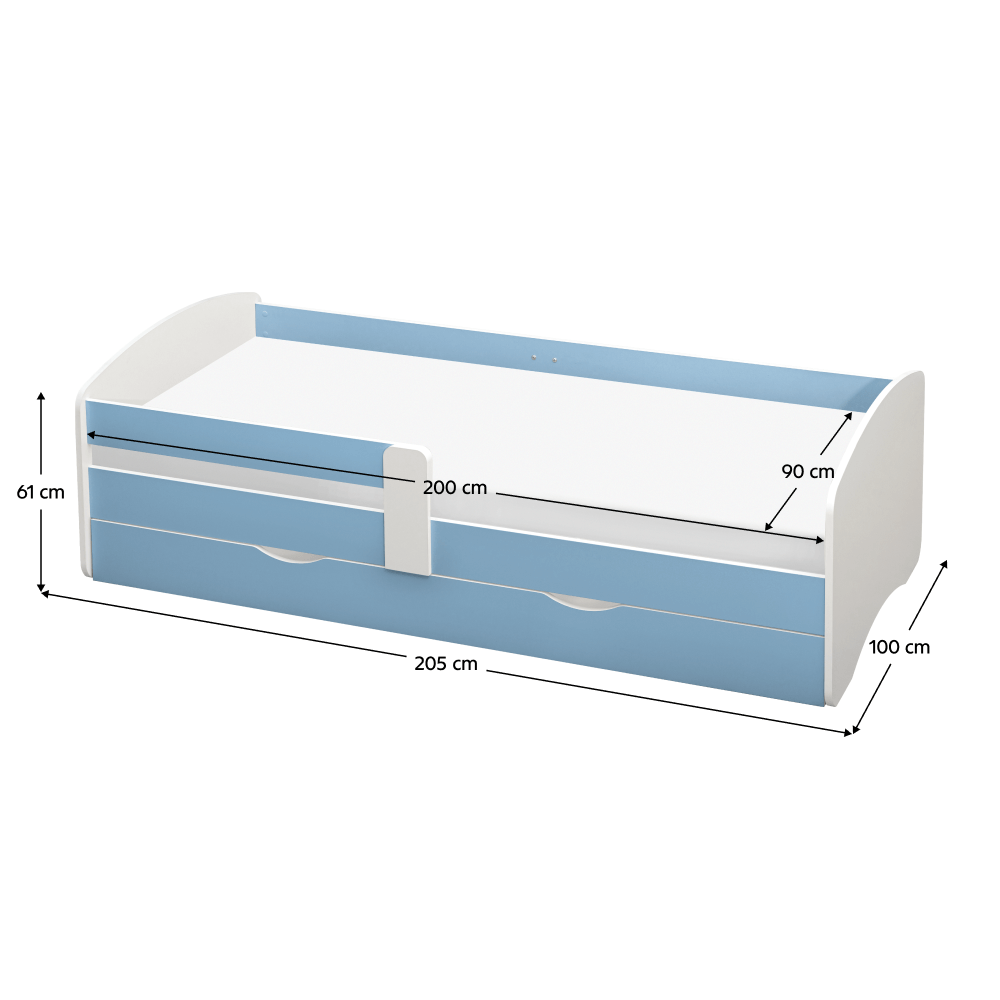 Materiál: laminovaná DTDFarba: biela/modráRozmery (ŠxHxV): 205x100x61 cmRozmery spania (ŠxD): 90x200 cmHrúbka materiálu: 1,8 cmMožnosť namontovať zábranu na ľavú alebo pravú stranuModerná a praktickáS úložným priestoromÚložný priestor na kolieskachDva šuplíkyHmotnosť: 55 kgNosnosť: 90 kgDodávaná s lamelovým roštomDodávaná bez matracaMožnosť dokúpiť matrac z našej ponukyDodávaná v demonte