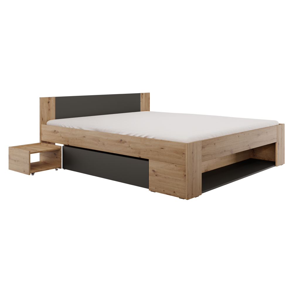 Materiál: laminovaná DTDFarba: dub artisan/antracitRozmery (ŠxHxV): 185x203,6x75,5 cmPlocha na spanie (ŠxD): 180x200 cmHrúbka laminovanej DTD: 1,6-1,8 cmVýška bočnice: 18 cmOdporúčaná minimálna výška matraca: 14 cmNosnosť na osobu: 90 kg2x úložný priestor na kolieskach2x nočný stolík na kolieskachPlastové klzákyVýška plastových klzákov: 0,5 cmDodávaná bez roštu a matracaMožnosť zakúpiť rošt a matrac z našej ponukyModerný dizajnDodávané v demonte