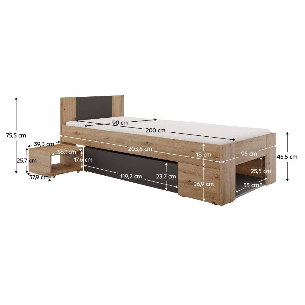 Materiál: laminovaná DTDFarba: dub artisan/antracitRozmery (ŠxHxV): 95x203,6x75,5 cmPlocha na spanie (ŠxD): 90x200 cmHrúbka laminovanej DTD: 1,6-1,8 cmVýška bočnice: 18 cmOdporúčaná minimálna výška matraca: 14 cmNosnosť na osobu: 90 kgJednolôžkováÚložný priestor na kolieskachNočný stolík na kolieskachPlastové klzákyVýška plastových klzákov: 0,5 cmDodávaná bez roštu a matracaMožnosť zakúpiť rošt a matrac z našej ponukyModerný dizajnDodávané v demonte