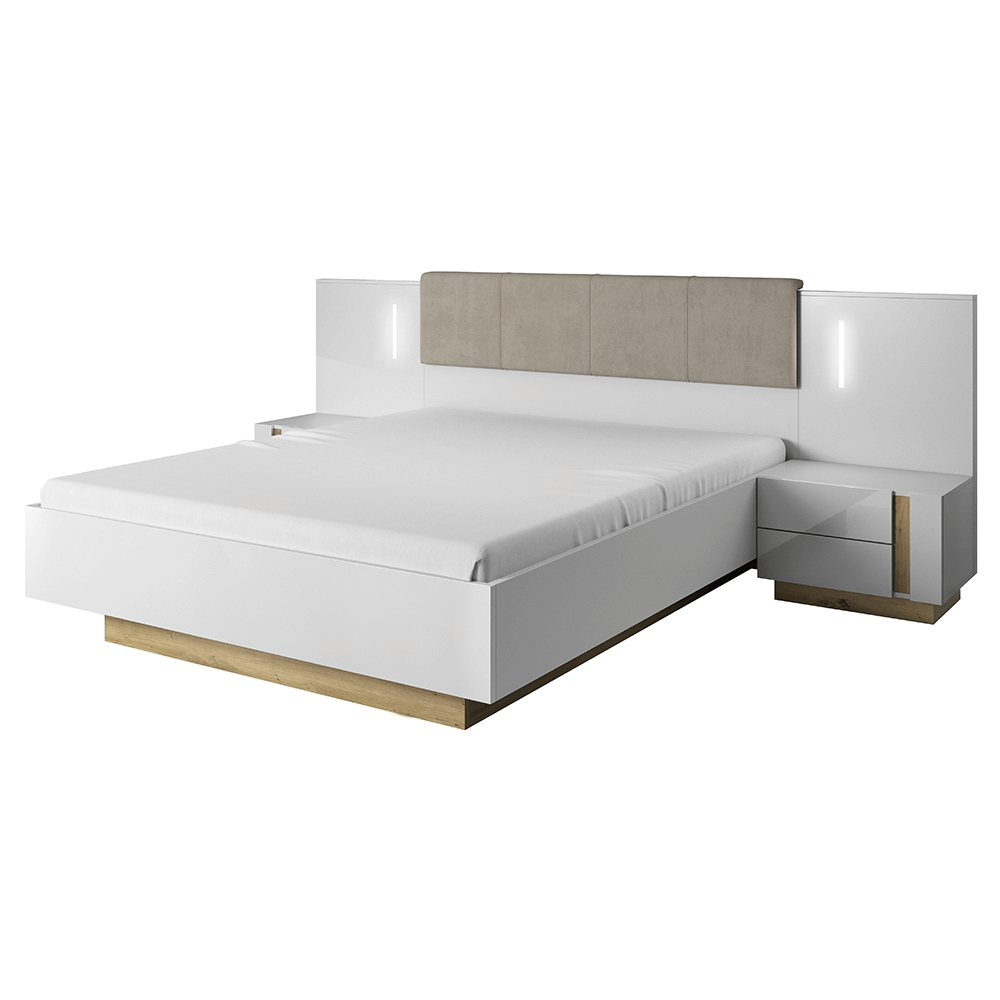 Materiál: DTD laminovaná/ABS hranyFarba: biela/dub grandson/biely leskRozmery (ŠxHxV): 164,4x210,4x104,5 cmPlocha na spanie (ŠxD): 160x200Hrúbka materiálu: 16 mm Nosnosť: 110 kgS čalúneným čelomS úložným priestoromPosteľ dodávaná bez roštu a bez matracaOdporúčame zakúpiť matrac s minimálnou výškou 15 cmDodávané v demonte