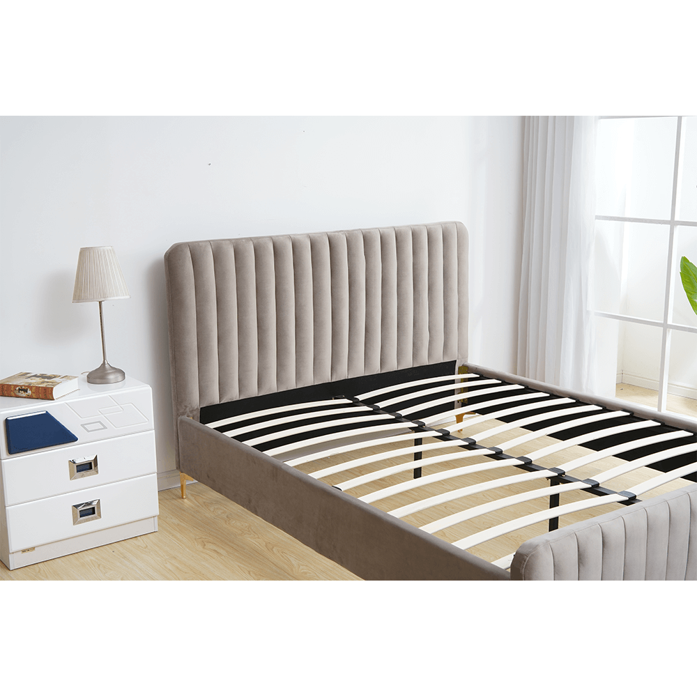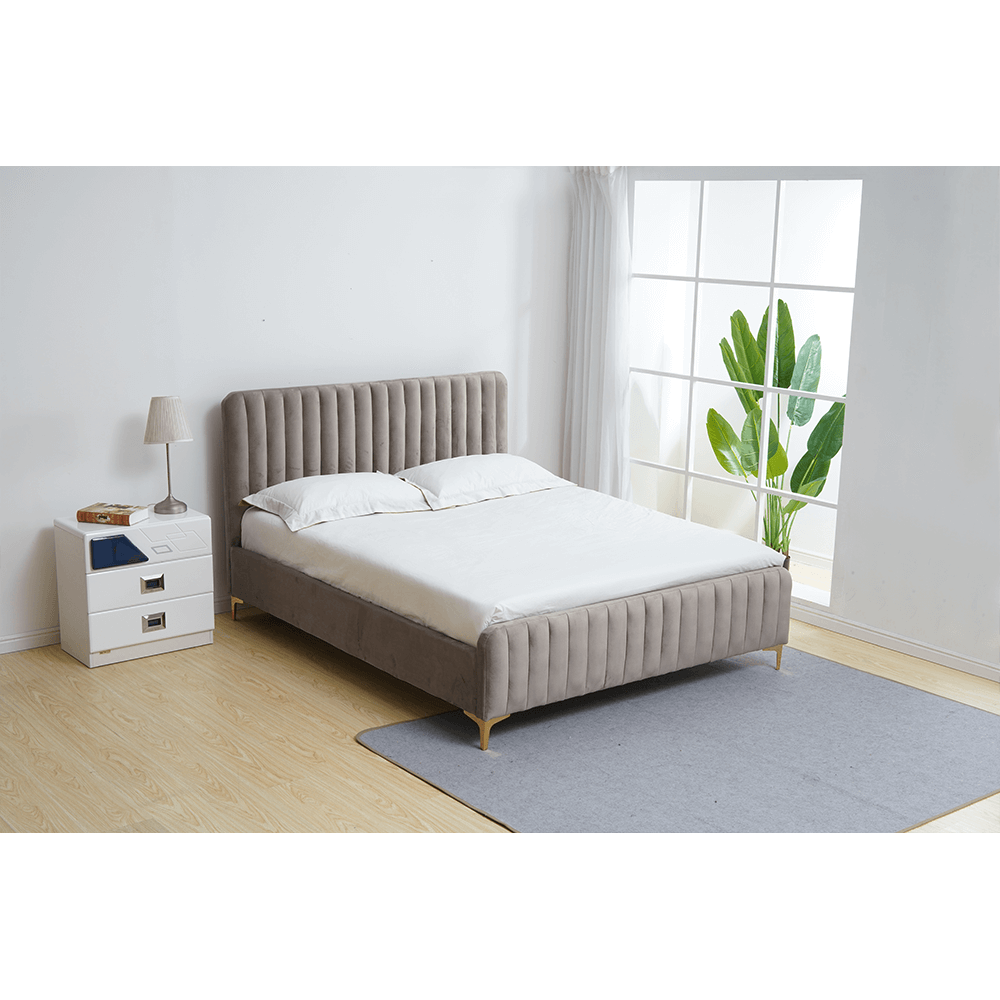 Materiál čalúnenia: Velvet látkaOderuodolnosť textílie podľa testu Martindale: 80 000 oderovFarba čalúnenia: sivohnedá TaupeMateriál nohy: kov chrómFarba nohy: gold zlatý matnýRozmery (ŠxHxV): 150x210x110 cmPlocha na spanie (ŠxH): 140x200 cmVýška po rošt : 28 cmDodávané s lamelovým roštomNosnosť na jedno lôžko: 110 kgKovové nohyDekoratívne prešívané čeláDodávané bez matracaMožnosť zakúpiť matrace z našej ponukyK posteli je potrebné zakúpiť matrac min. s výškou 20 cmDodávané v demonte