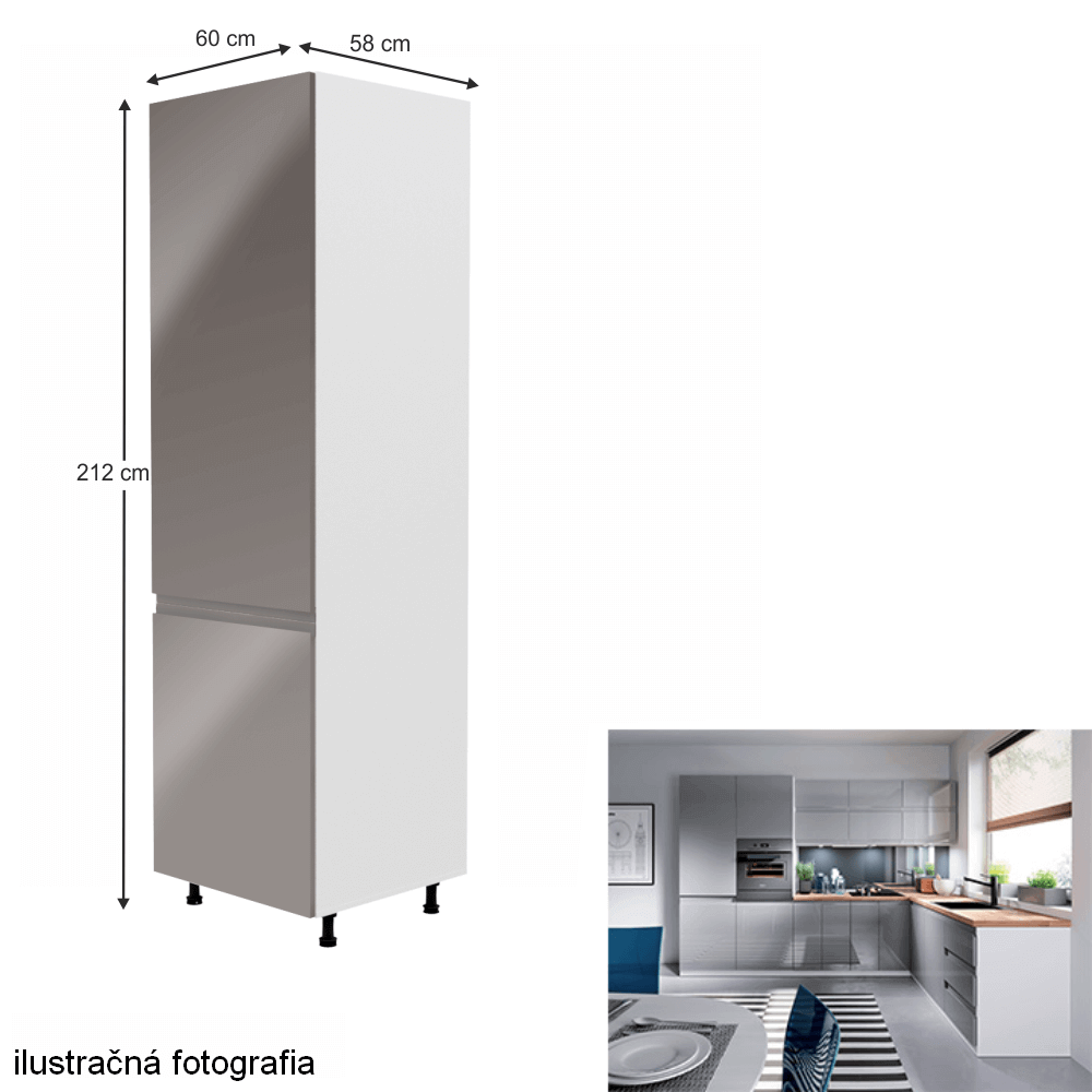 Potravinová skrinka, Aurora D60RPrevedenie: DTD laminová/MDFFarba: biela/sivá extra vysoký leskRozmery (ŠxHxV): 60x58x212 cmHrúbka materiálu: 15 mmSystém tichého zatvárania dvierokJe nutné objednať potrebný počet ukončení spodnej lištyPracovná doska nie je súčasťou skriniek. Je možné si doobjednať pracovnú dosku v prevedení dub artisan s hrúbkou 38 mm za 56 eur/bm. Možnosť dokúpiť drez LAY ON. Spodné skrinky sú dodávané vrátane dolnej lišty, avšak presný rozmer, ktorý potrebujete, je potrebné uviesť do poznámky v objednávke. Ak rozmer neuvediete, môže sa stať, že vám sokel nebude dodaný. Ku každej dolnej skrinke, okrem D25PZ, je potrebné doobjednať 2 ks úchytok na sokel - cena 1Eur/2ks.
