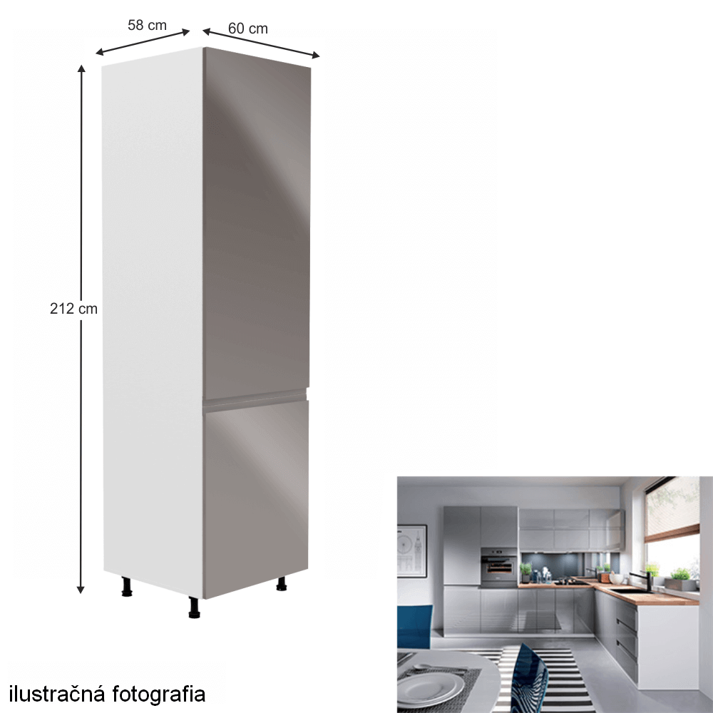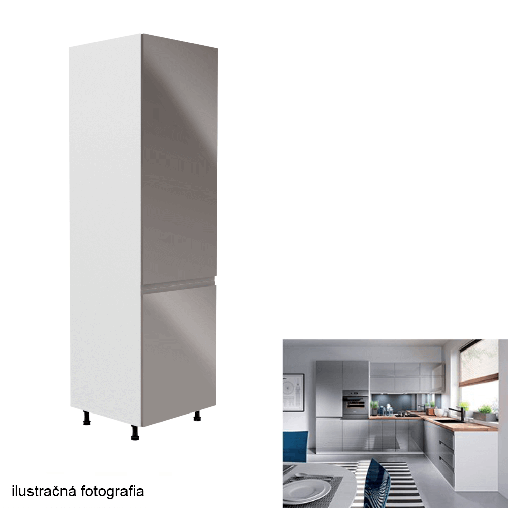 Potravinová skrinka, Aurora D60RPrevedenie: DTD laminová/MDFFarba: biela/sivá extra vysoký leskRozmery (ŠxHxV): 60x58x212 cmHrúbka materiálu: 15 mmSystém tichého zatvárania dvierokJe nutné objednať potrebný počet ukončení spodnej lištyPracovná doska nie je súčasťou skriniek. Je možné si doobjednať pracovnú dosku v prevedení dub artisan s hrúbkou 38 mm za 56 eur/bm. Možnosť dokúpiť drez LAY ON. Spodné skrinky sú dodávané vrátane dolnej lišty, avšak presný rozmer, ktorý potrebujete, je potrebné uviesť do poznámky v objednávke. Ak rozmer neuvediete, môže sa stať, že vám sokel nebude dodaný. Ku každej dolnej skrinke, okrem D25PZ, je potrebné doobjednať 2 ks úchytok na sokel - cena 1Eur/2ks.