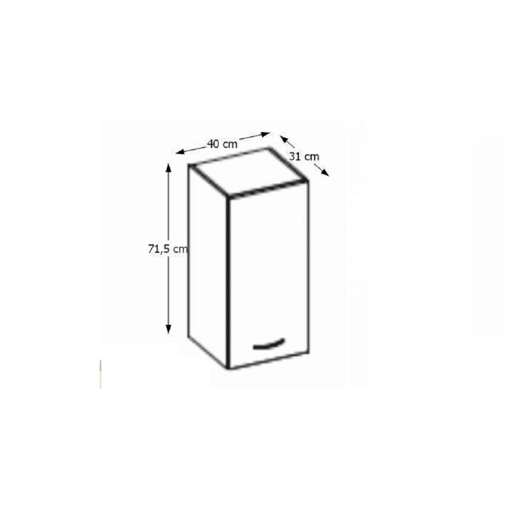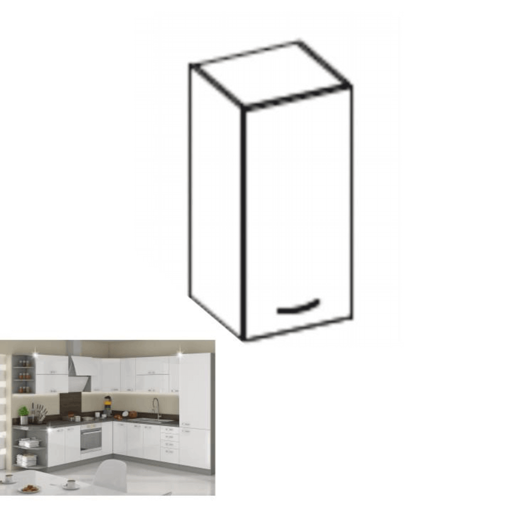 Horná skrinka, Materiál: DTD laminovaná, Prevedenie: biela vysoký lesk, Rozmery ŠxVxH: 40x71,5x31 cm. Dodávané v demonte.Sektorové skrinky sú dodávané bez pracovnej dosky vrátane spodnej lišty. Možnosť dokúpiť PD metalic brown v cene 55 Eur/1m. Možnosť dokúpiť univerzálny Ľ/P drez LAY ON.
