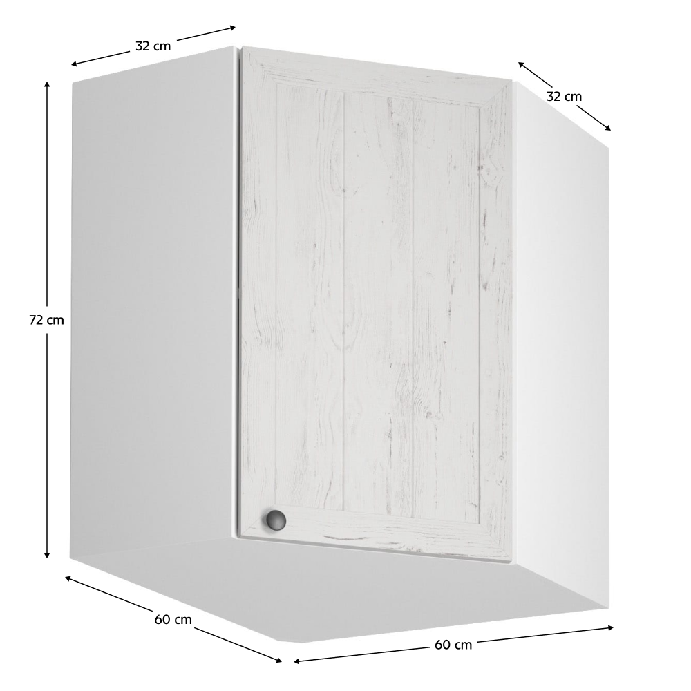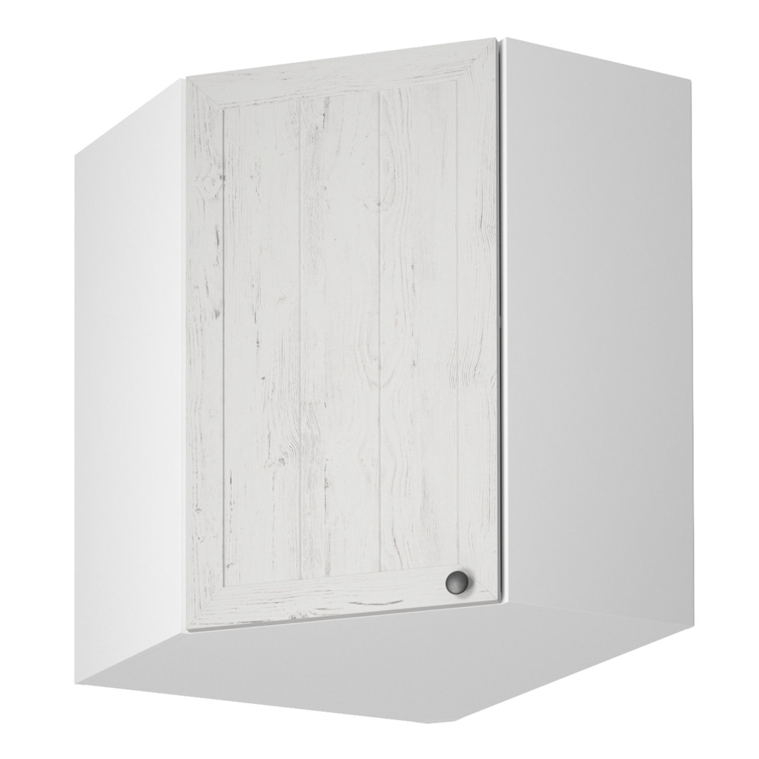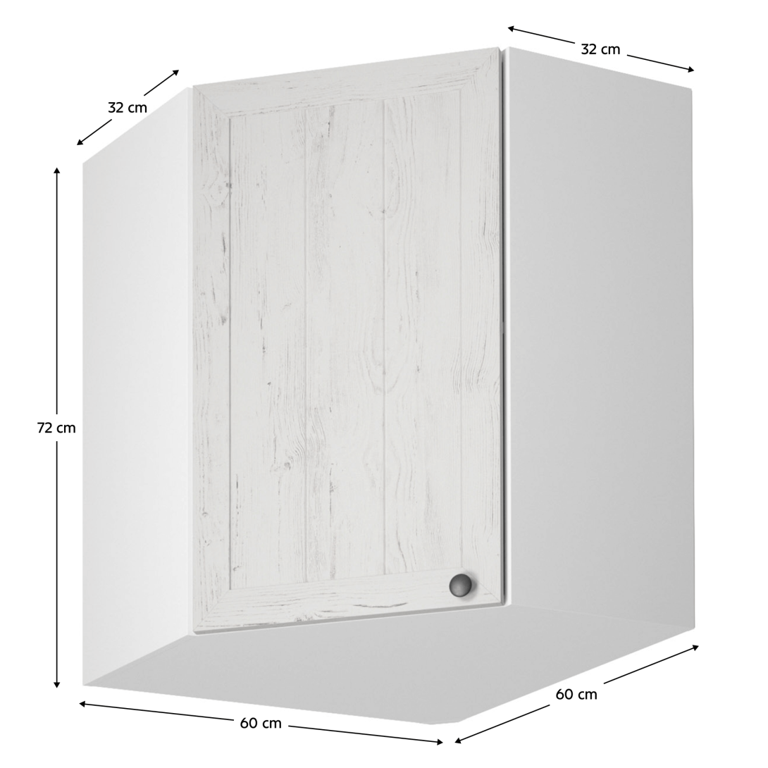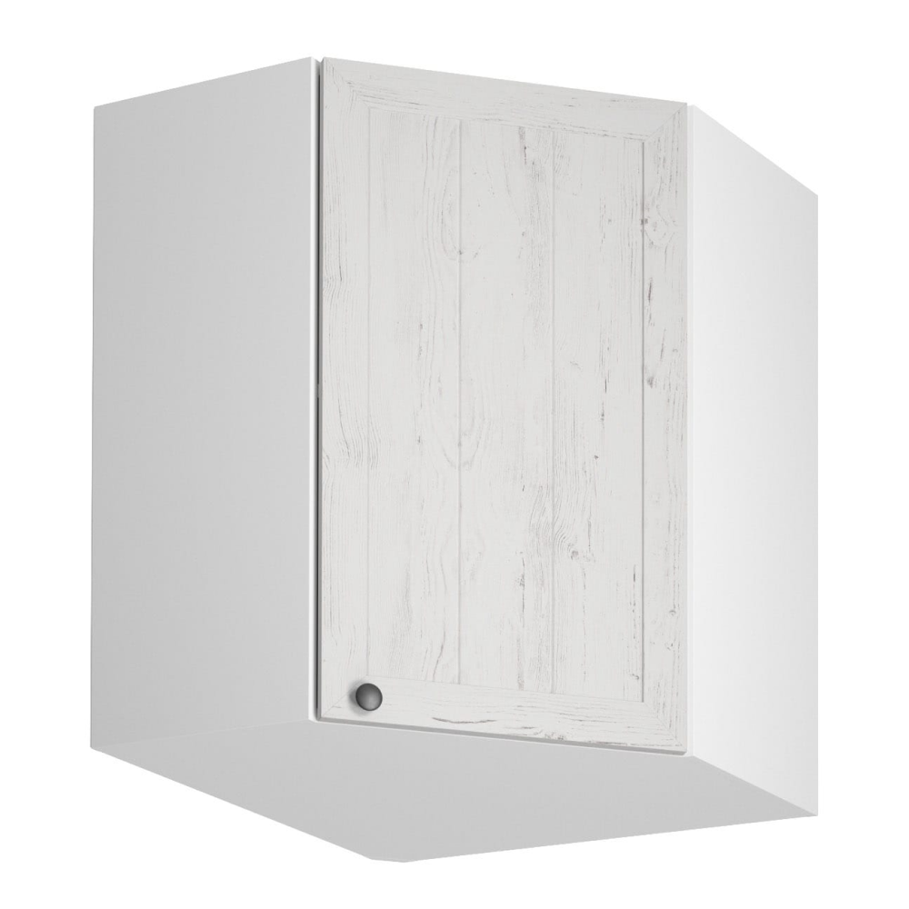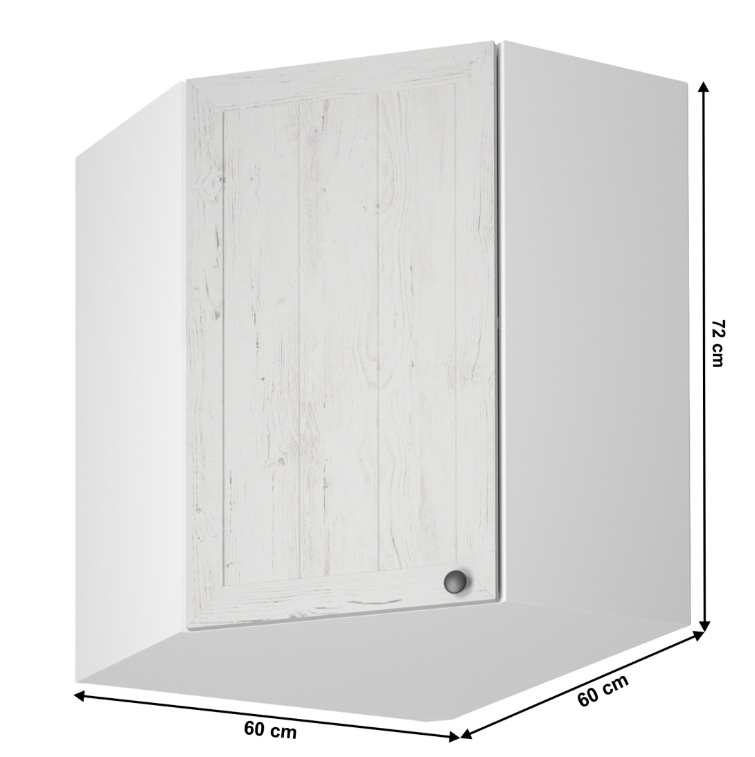 Horná rohová skrinka s dvierkami a jednou policou ku kuchyni PROVANCEPrevedenie: DTD laminovaná/MDF/skloFarba: biely/sosna andersenRozmery (ŠxHxV): 60x60x72 cmHrúbka materiálu: 15 mmCena sektorových skriniek je uvádzaná bez pracovnej dosky a spodnej lišty. Cena za pracovnú dosku dub lancelot je 56 Eur/bm - hrúbka 38 mm, cena za spodnú lištu je 14 Eur. Ku každej dolnej skrinke okrem D25PZ, je potrebné doobjednať 2 ks úchytov na sokel cena 1 Eur/2 ks.