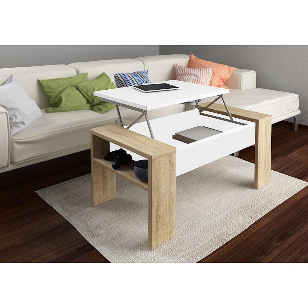 Konferenčný stolík PULAMateriál: DTD laminovanáFarba: dub sonoma/bielaRozmery (ŠxHxV): 98x50x43-54 cmHrúbka materiálu vrchný plát: 22 mmHrúbka materiálu korpus: 16 mmVýškovo nastaviteľná vrchná doskaS manuálnym zdvíhacím mechanizmom.Dodávané v demonte.