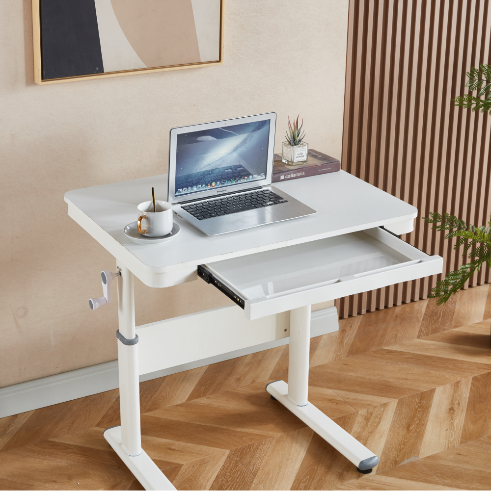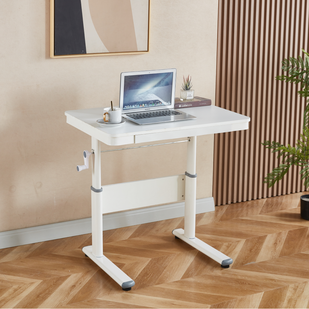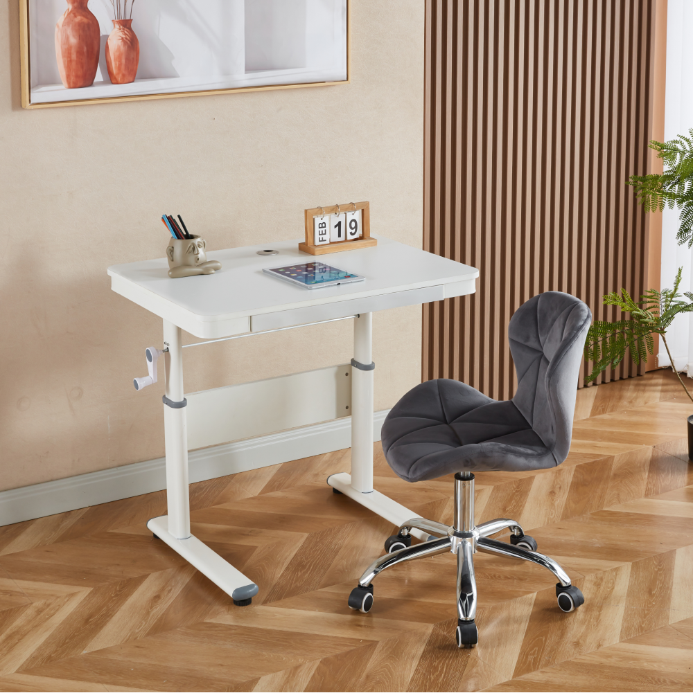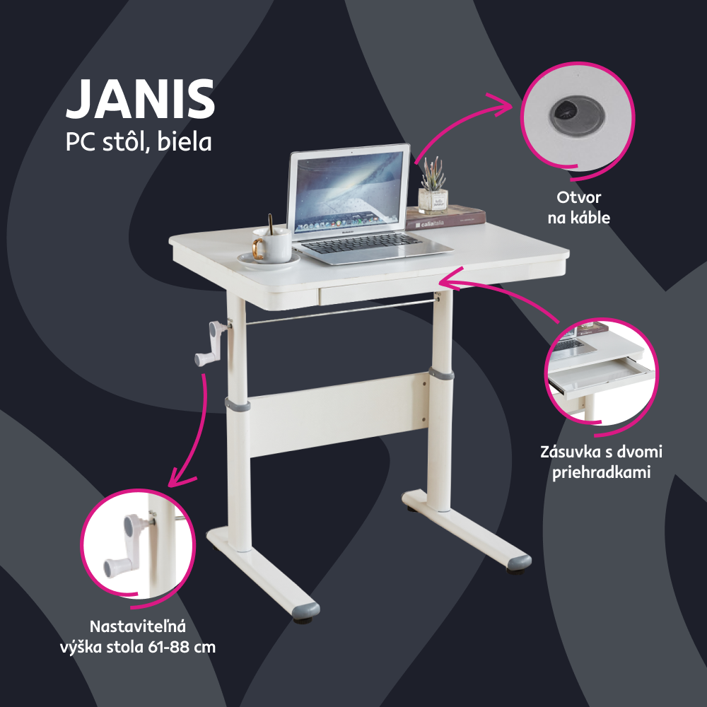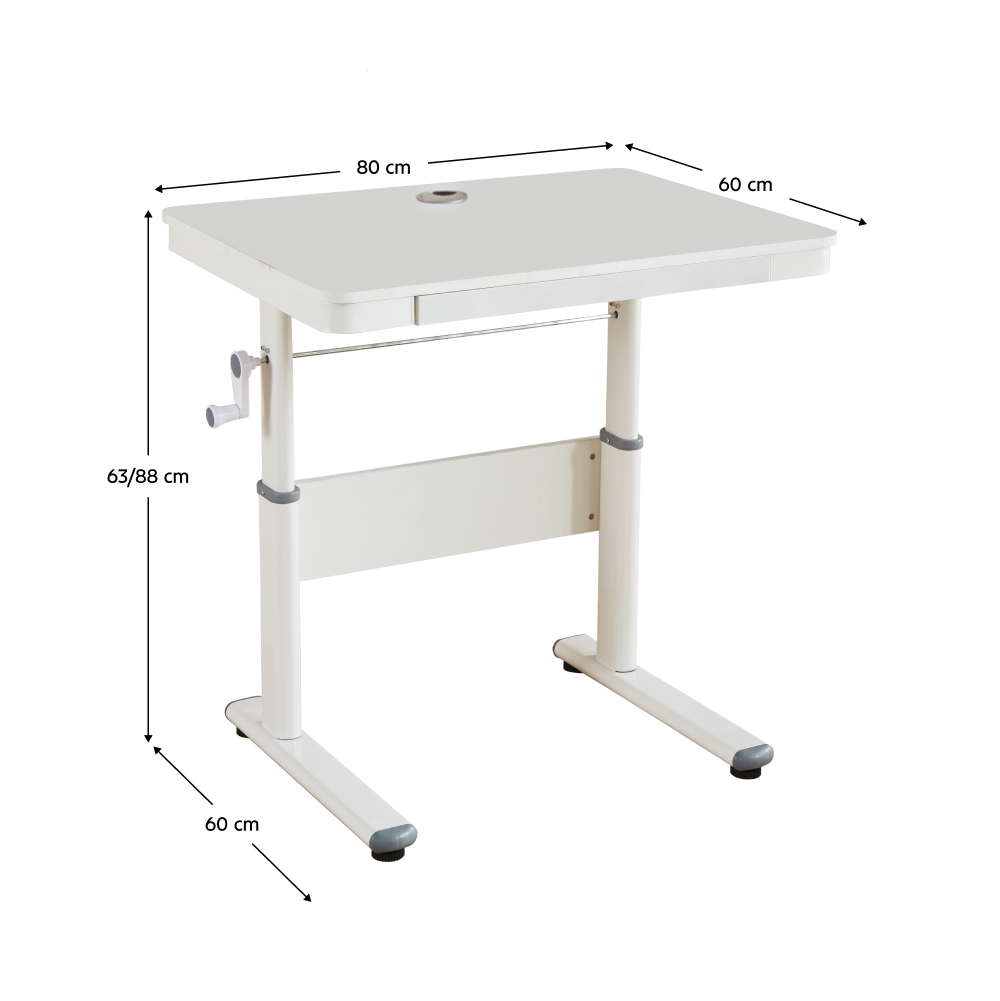 Materiál: MDF/PVC fólia/kovFarba: bielaRozmery stola (ŠxHxV): 80x60x63-88 cmHrúbka materiálu MDF s PVC fóliou: 1,5 cmNosnosť: 30 kgHmotnosť: 15,3 kgVhodné od 3 do 18 rokovNastaviteľná výška stolaManuálne nastavenie výšky stola pomocou kľukyJeden šuplíkVnútorné rozmery šuplíka (ŠxHxV): 50x30x3,5 cmDve malé priehradky na peráKovové koľajničkyOtvor na prevedenie káblovDodávané v demonte