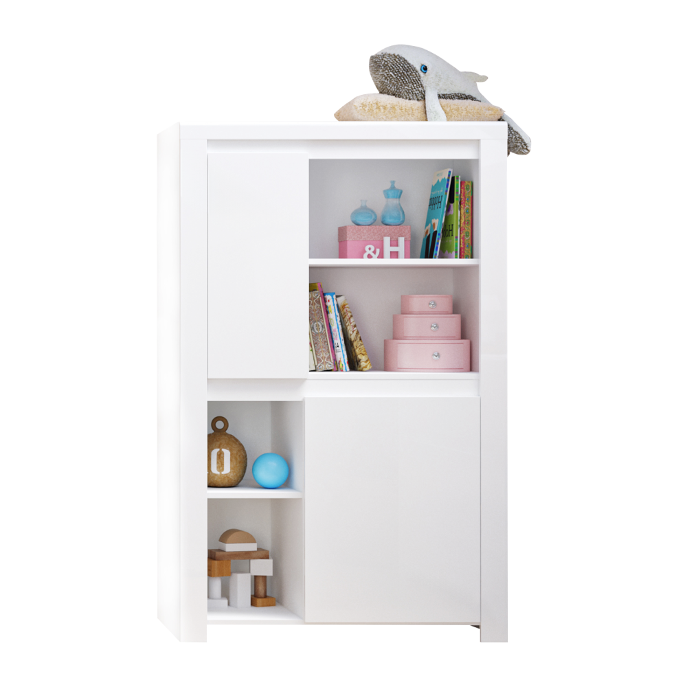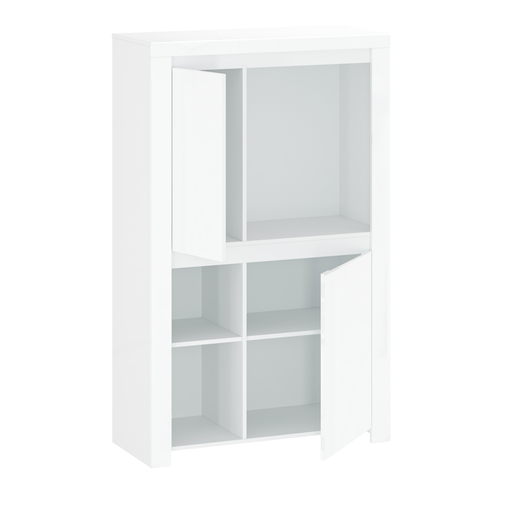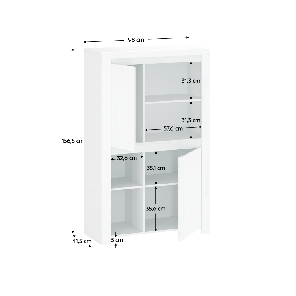 Materiál: laminovaná DTD/MDFFarba: biely leskRozmery (ŠxHxV): 98x41,5x156,5Materiál dvierka: MDFHrúbka materiálu: 1,6 cmABS hranyKombinovaný regálObsahuje otvorené police a dve skrinkyOtvorený aj uzavretý úložný priestorBez úchytiekModerný dizajn a atraktívny dizajnDodávané v demonte