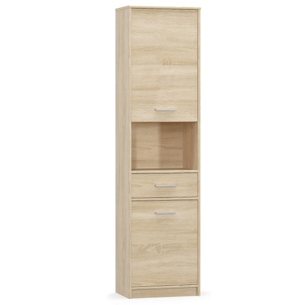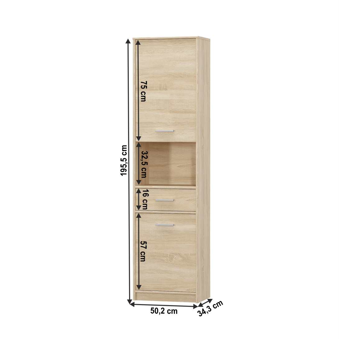 Regál 2D1S TEYOMateriál: DTD laminovanáFarba: dub sonomaRozmery (ŠxHxV): 50,2x34,3x195,5 cmHrúbka materiálu: 16 mm Univerzálne dvierkaDodávané v demonte.