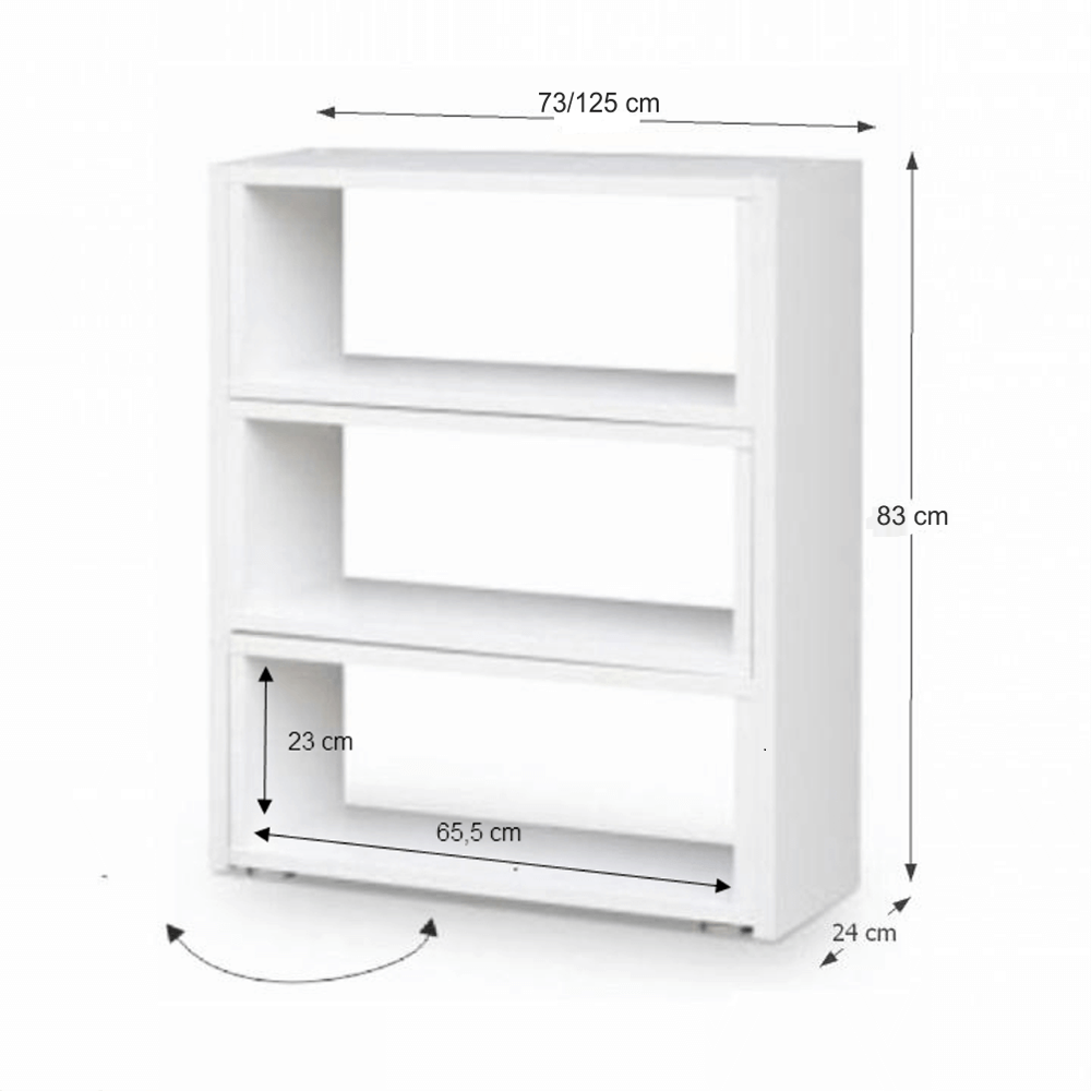 Moderný viacúčelový regálový systém KLOE IIIMateriál: DTD laminovanáPrevedenie: bielaRozmery (ŠxHxV): 73-125x24x83 cmDodávané v demonte.