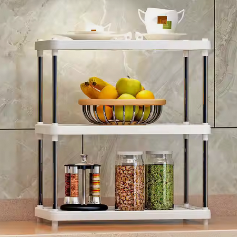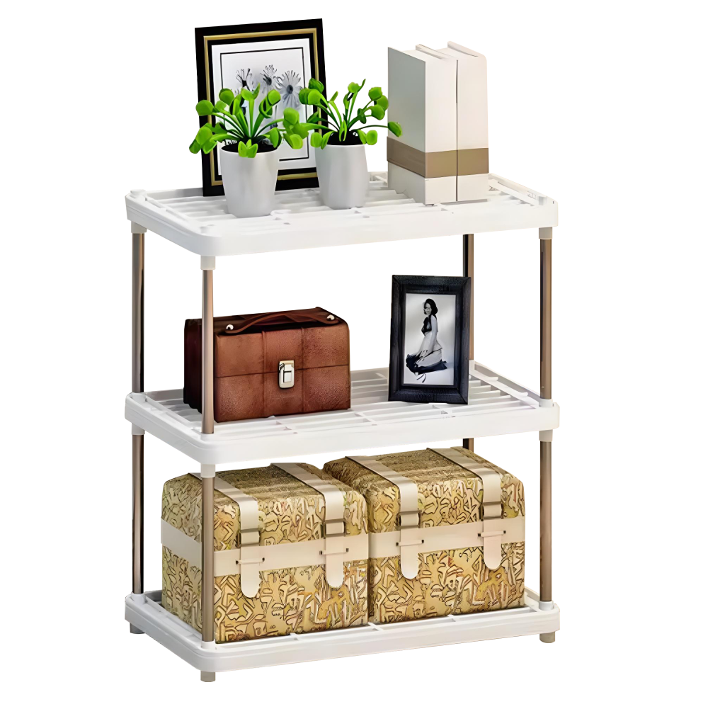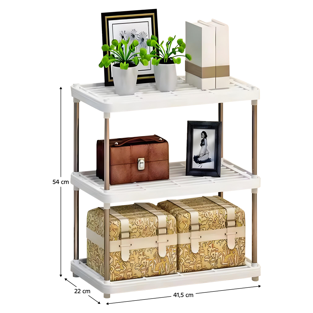Materiál: železo/plastFarba: biela/siváRozmery (ŠxHxV): 41,5x22x54 cmHrúbka tyče: 1,3 cmTri odkladacie plochyNosnosť: 4 kgModerný dizajnPraktickýViacúčelovýDodávané v demonte