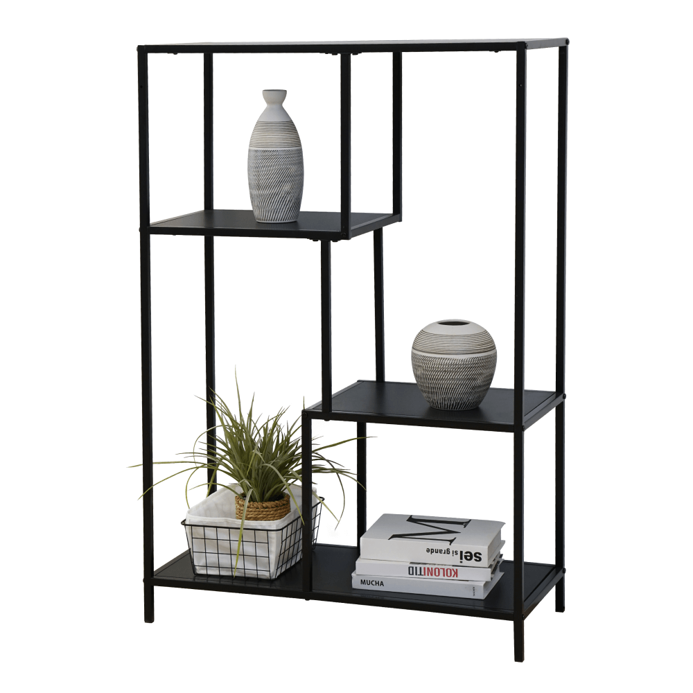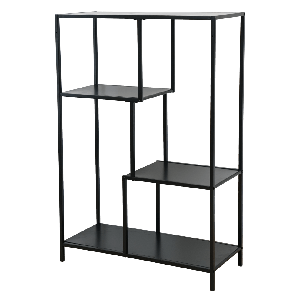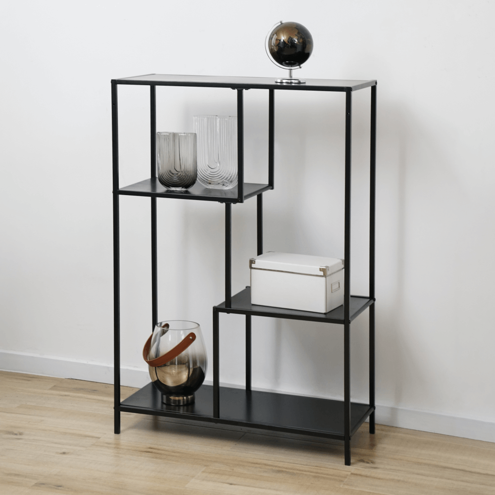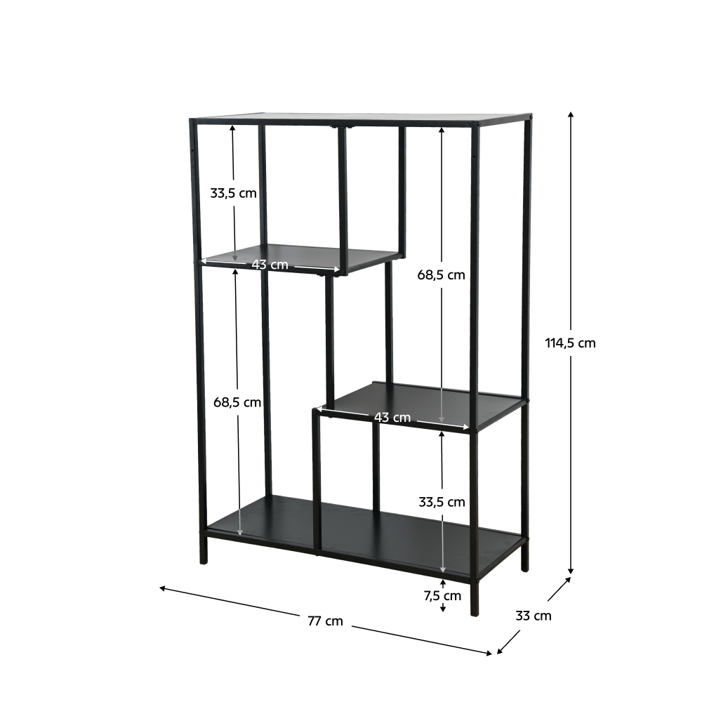 Materiál: kovFarba: čiernaRozmery (ŠxHxV): 77x33x114,5 cmVýška nožičiek: 7,5 cmNosnosť na jednu policu: 5 kgOtvorený úložný priestorŠtyri odkladacie plochyKovová konštrukciaOdporúčame pripevniť k steneDodávané v demonte