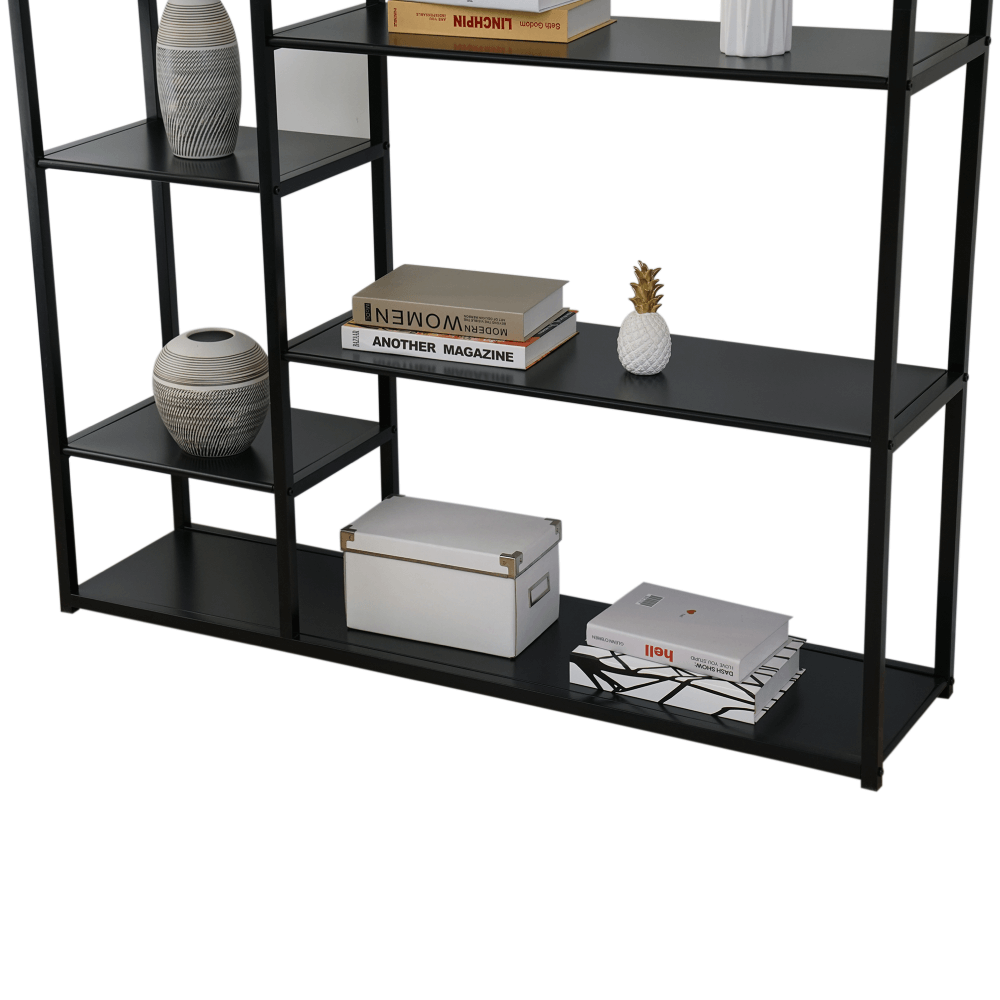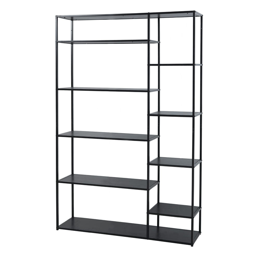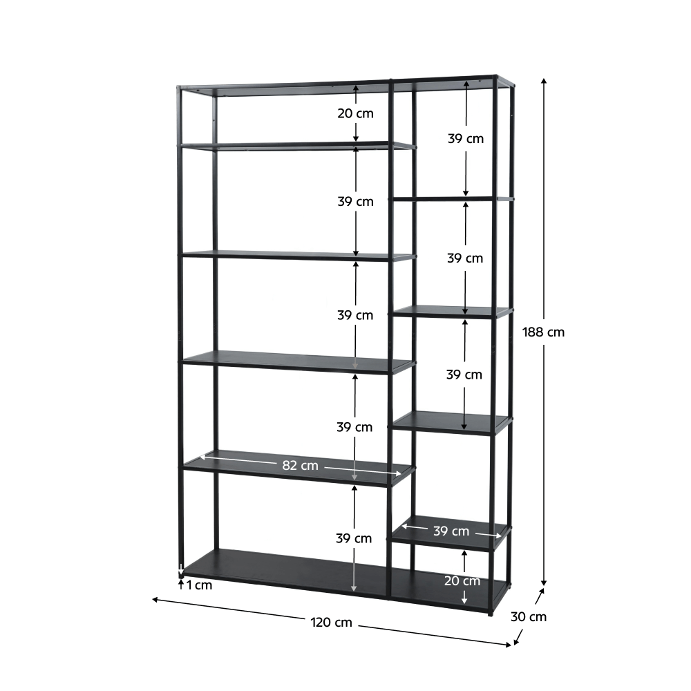 Materiál: kovFarba: čiernaRozmery (ŠxHxV): 120x30x188 cmVýška nožičiek: 1 cmNosnosť na jednu policu: 10 kgOtvorený úložný priestorDesať odkladacích plôchKovová konštrukciaOdporúčame pripevniť k steneDodávané v demonte