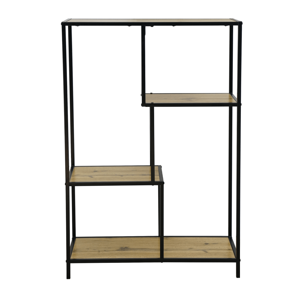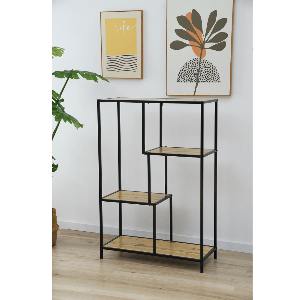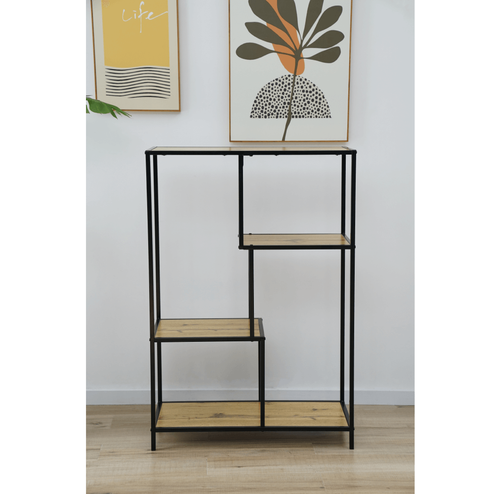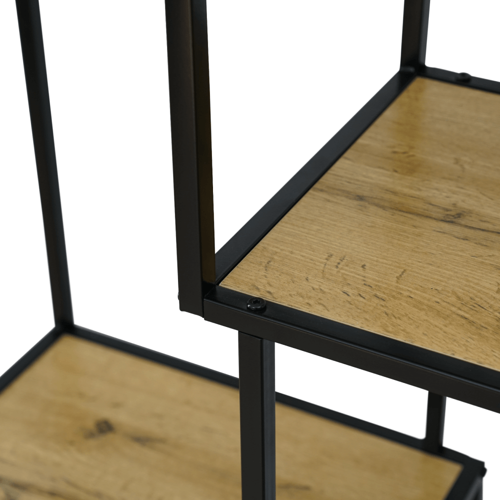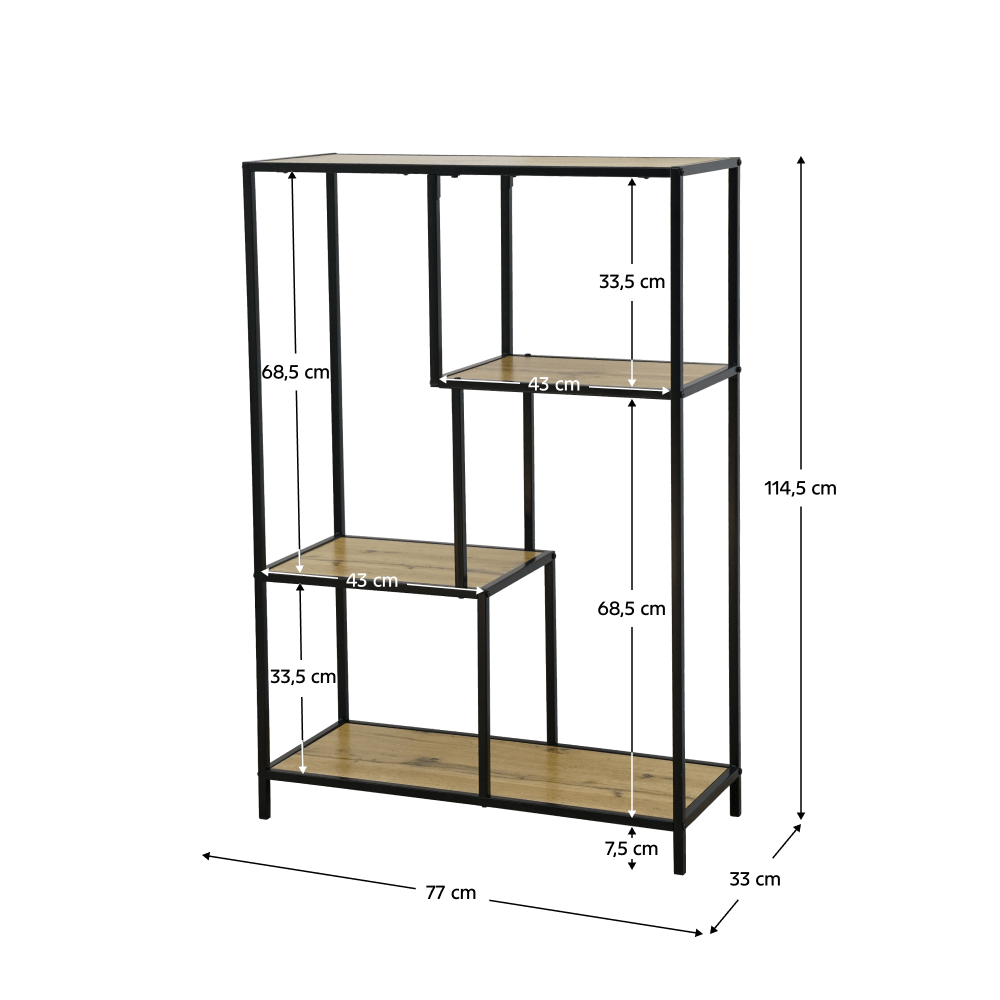 Materiál: kov/MDF laminovanáFarba: čierna/dub Rozmery (ŠxHxV): 77x33x114,5 cmHrúbka MDF: 1,5 cmVýška nožičiek: 7,5 cmNosnosť na jednu policu: 5 kgOtvorený úložný priestorŠtyri odkladacie plochyKovová konštrukciaOdporúčame pripevniť k steneDodávané v demonte