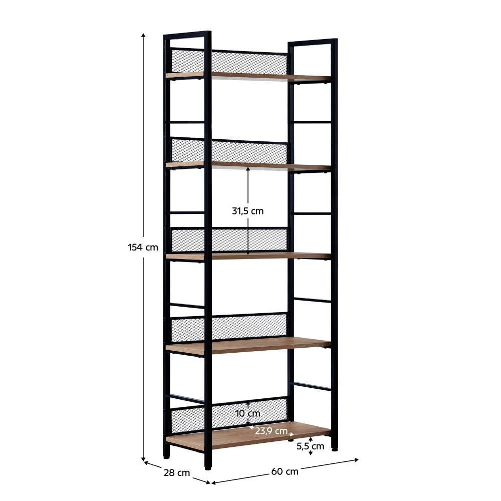 Materiál: kov/DTD laminovanáFarba: čierna/dubRozmery (ŠxHxV): 60x28x154 cmNosnosť na jednu policu: 10 kgHrúbka materiálu: 1,5 cmRozmery police (ŠxH): 60x23,9 cmVýška medzi policami: 31,5 cmVýška nožičiek: 5,5 cmOtvorený úložný priestorPäť odkladacích plôchKovová konštrukciaViacúčelovýModernýPraktickýKombinovateľný s KELER TYP 1-3Odporúčame pripevniť k steneDodávané v demonte