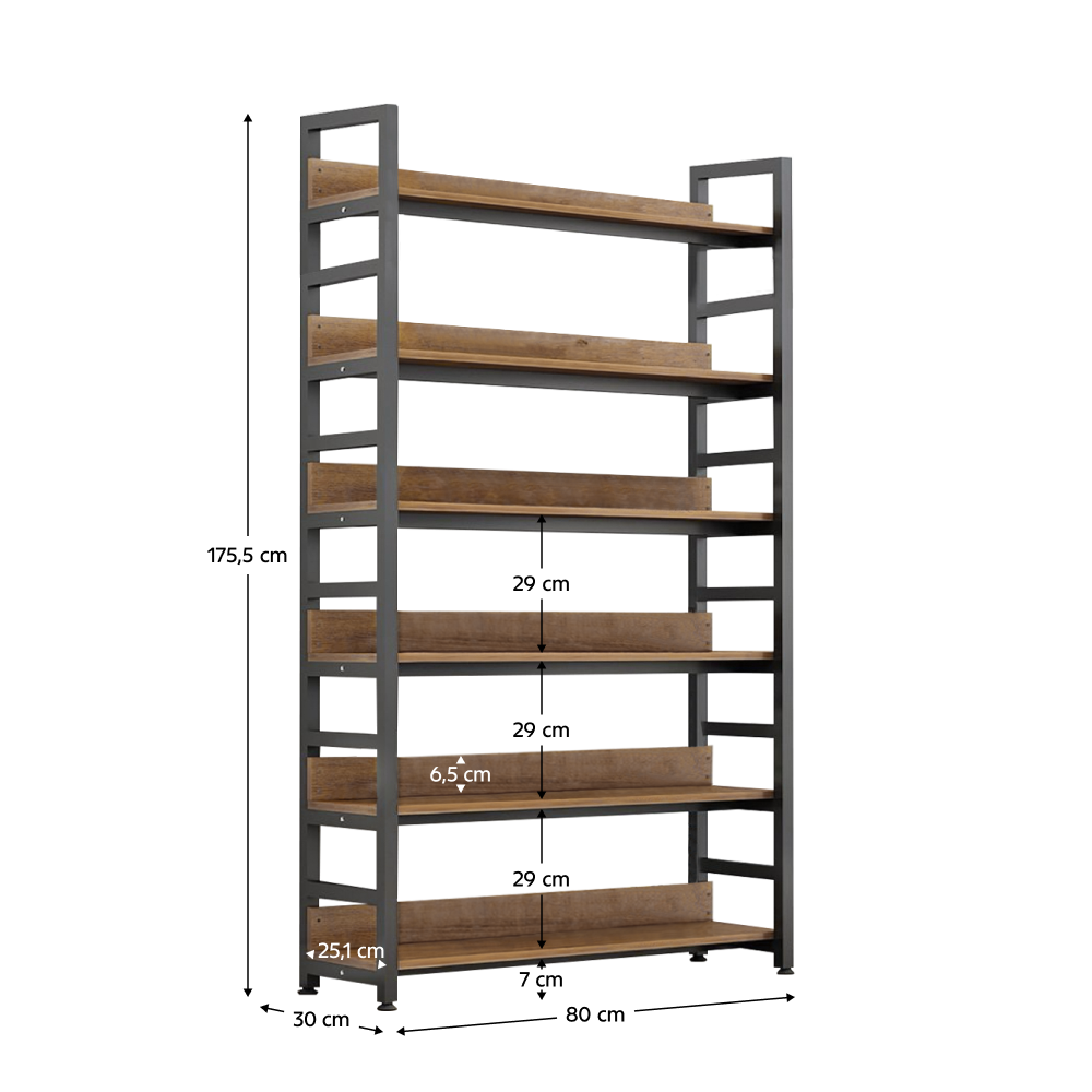 Materiál: laminovaná MDF/kovFarba: dub tmavý/čiernaRozmery (ŠxHxV): 80x30x175 cmHrúbka MDF: 1,2 cmVýška nožičiek: 5 cmPolicovýNosnosť police: 5 kgOtvorený úložný priestorŠesť odkladacích plôchViacúčelovýModernýPraktickýOdporúčame pripevniť k steneDodávaný v demonte