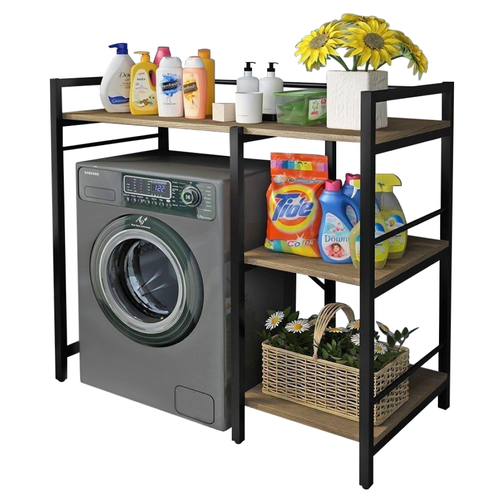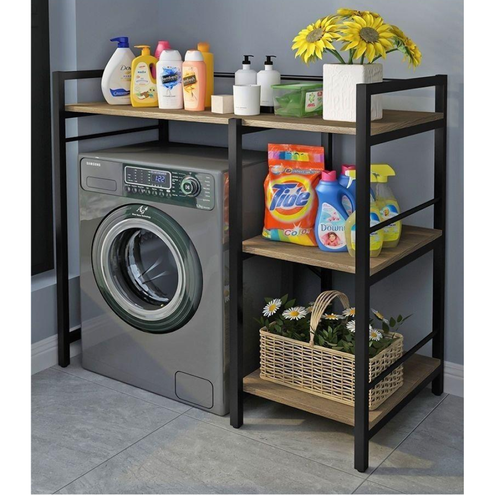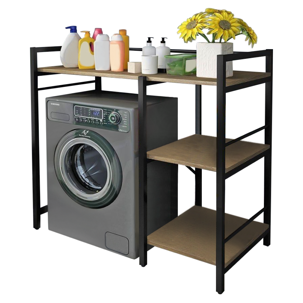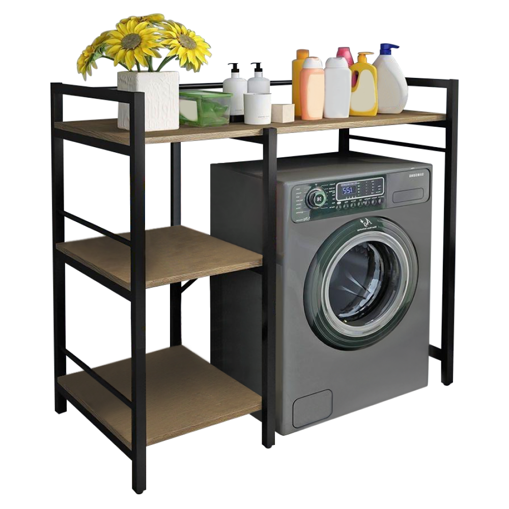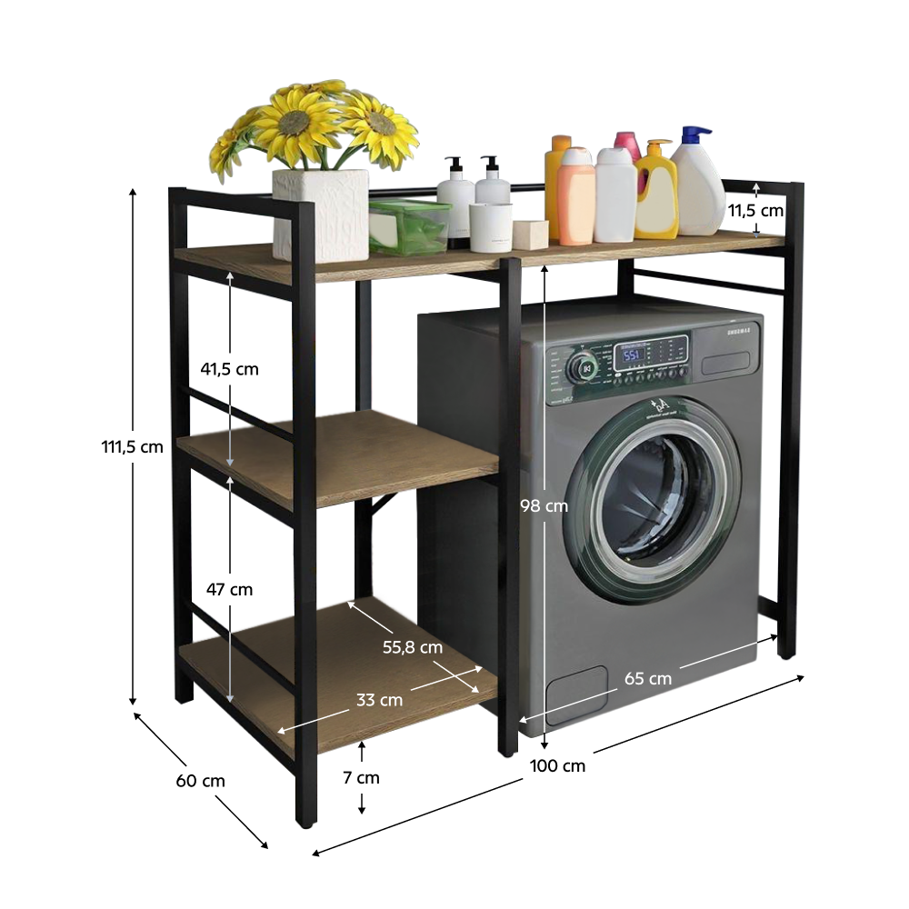 Materiál: laminovaná MDF/kovFarba: dub/čiernaRozmery (ŠxHxV): 100x60x111,5 cmPriestor na práčku: 65x98 cmHrúbka materiálu: 1,2 cmHmotnosť: 12,2 kgVýška nožičky: 7 cmOtvorené policeNosnosť na policu: 5 kgUniverzálnyPraktické vytvorenie úložného priestoruVhodný na práčku Prináša organizáciu a usporiadanie do kúpeľneDodávané v demonte